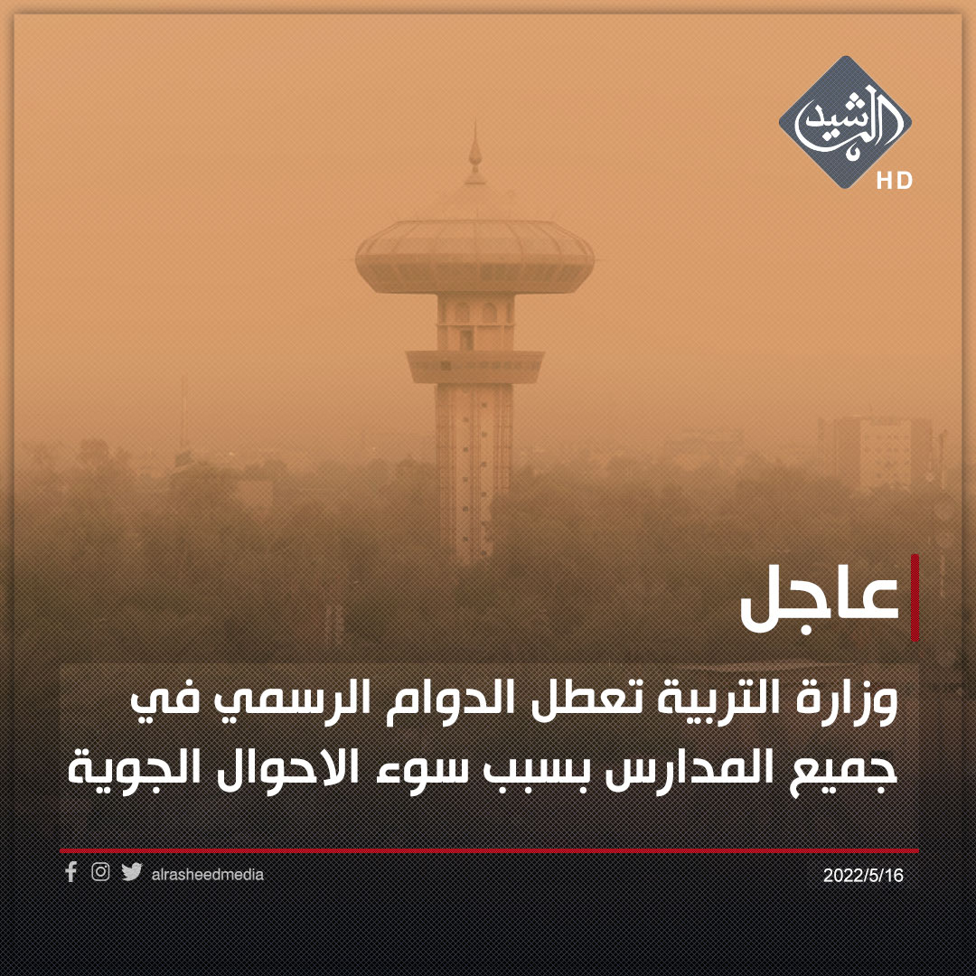 وذكرت الوزارة في بيان تلقته الرشيد، أنها قررت تعطيل الدوام الرسمي لليوم الاثنين الموافق 16 أيار في جميع المدارس وتأجيل الامتحانات إلى يوم غداً وذلك بسبب سوء الأحوال الجوية”.
