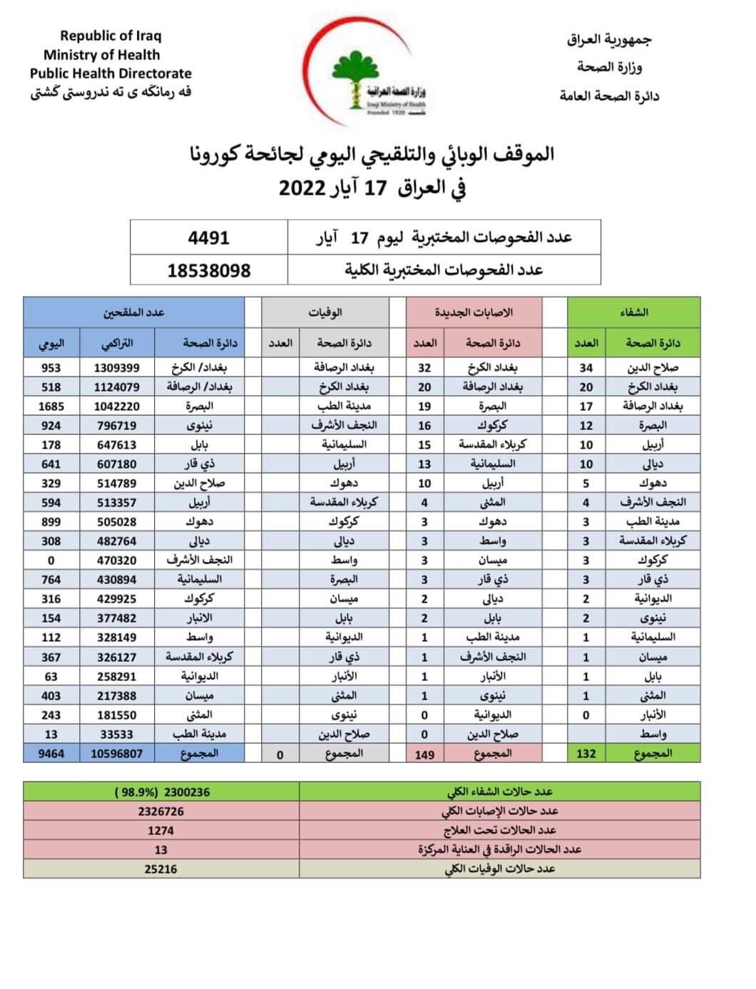 وقالت الوزارة، في بيان تلقته الرشيد، أنه “تم تسجيل 149 إصابة جديدة بفيروس كورونا، و 132 حالة شفاء من المرض، دون وفيات”.