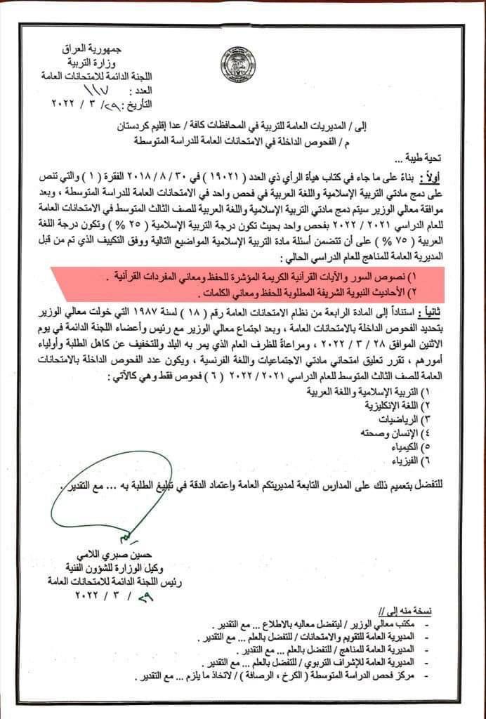 وأشارت، الى ان “المواضيع المطلوبة في امتحان مادة التربية الاسلامية لهذا العام بعد دمج امتحان المادة مع اللغة العربية هي (نصوص السور والآيات القرآنية الكريمة المؤشرة للحفظ ومعاني المفردات القرآنية و الأحاديث النبوية الشريفة المطلوبة للحفظ ومعاني الكلمات) فقط بناءً على ما جاء في كتاب اللجنة الدائمة للامتحانات العامة ذي العدد (117) في 29 آذار 2022”.