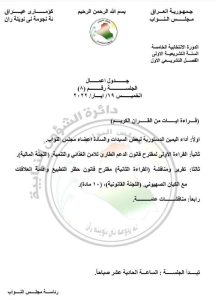 سياسةالرشيد تنشر جدول أعمال جلسة اليوم قبل 4 سنوات 2 مشاهدات شارك مجلس النواب الوسوممجلس النواب العراقيقد يهمك أيضا أمن القبض على أب قام بتعنيف ابنته في ذي قار قبل 8 دقائق 3 مشاهدات رياضة عودة دي يونج ولوبيز.. فليك يحشد نجوم برشلونة لموقعة بيتيس قبل 11 دقيقة 2 مشاهدات عربي ودولي نائب إيراني: أميركا بعثت رسالة للتفاوض لكننا رفضنا قبل 40 دقيقة 7 مشاهدات أقتصاد طهران: العراقيون هم أكبر المشترين للعقارات في إيران ويستثمرون بمحطات الوقود وتعبئة التمور والزبيب قبل ساعة واحدة 8 مشاهدات أقتصاد مرصد: العجز المالي في العراق بلغ نحو 18 تريليون دينار حتى نهاية أيلول الماضي قبل ساعة واحدة 8 مشاهدات