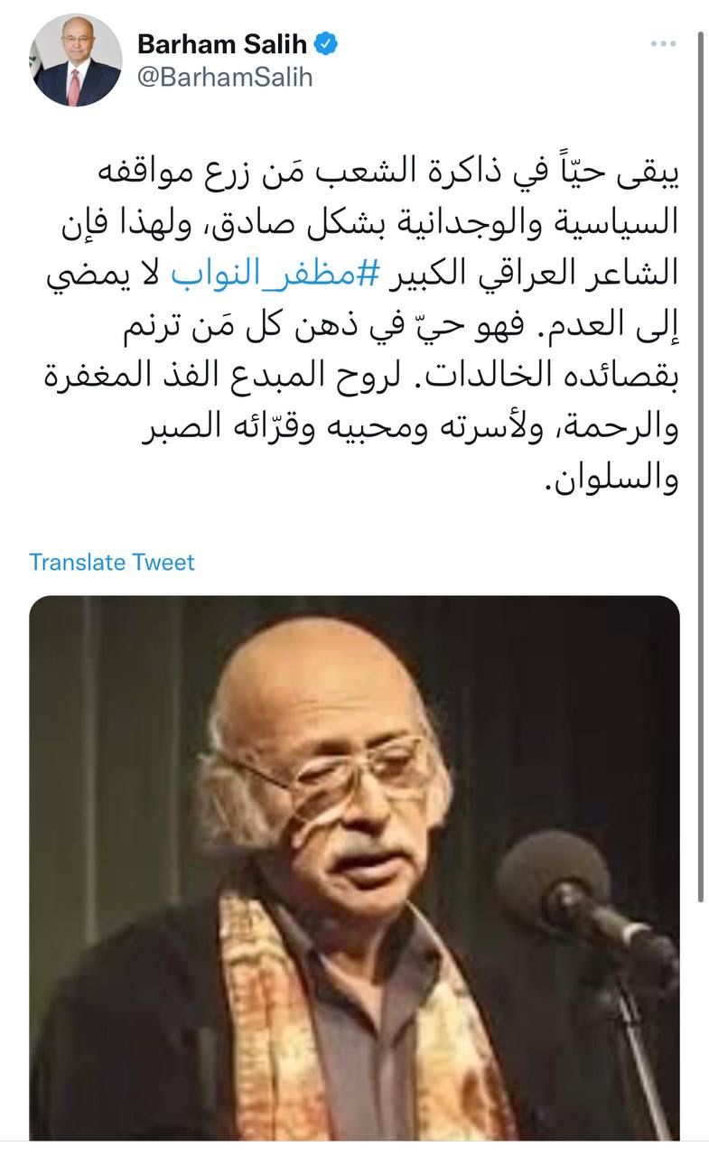 محلياترئيس الجمهورية ينعى الشاعر العراقي مظفر النواب قبل 4 سنوات 4 مشاهدات شارك الوسومبرهم صالحمظفر النوابقد يهمك أيضا أمن مقتل شاب برصاصة أطلقها منتسب أمني بالخطأ خلال "مشاجرة اعتيادية" في أبي غريب غربي بغداد قبل 6 ساعات 9 مشاهدات رياضة مدرب الأرجنتين معلقاً على قرعة المونديال: منتخب الجزائر قوي والأردن مجهول بالنسبة لي قبل 6 ساعات 18 مشاهدات محليات العراق يستقبل موجة أمطار غزيرة.. الأنواء تحذر من سيول وفيضانات في المناطق غير المخدومة اعتباراً من الغد قبل 7 ساعات 17 مشاهدات محليات المالية تنفي استقبال نائبة للتفاوض مع وزيرتها بشأن مستحقات المقاولين قبل 7 ساعات 10 مشاهدات عربي ودولي البيت الأبيض يحذر: أوروبا مهددة بـ"زوال الحضارة" خلال 20 عاماً قبل 7 ساعات 10 مشاهدات