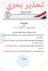 محلياتالموانئ العراقية تصدر تحذيرا بحريا: الأمواج قد ترتفع والرؤية تنعدم بسبب العاصفة قبل 4 سنوات 7 مشاهدات شارك الوسومالموانئ العراقيةقد يهمك أيضا محليات طقس العراق.. ضباب وانخفاض في درجات الحرارة خلال الأيام المقبلة قبل 7 دقائق 1 مشاهدة عربي ودولي وزير الخارجية التركي: الخروقات الإسرائيلية تعرقل الانتقال إلى المرحلة الثانية في غزة قبل 33 دقيقة 5 مشاهدات أمن جهاز المخابرات ينفي تلقي الحكومة تحذيرًا عربيًا وغربيًا بقرب تعرض العراق لضربات عسكرية قبل 8 ساعات 23 مشاهدات أمن الداخلية تنفي اي محاولة لعبور اشخاص من سوريا عبر الجدار الكونكريتي على الشريط الحدودي قبل 10 ساعات 15 مشاهدات عربي ودولي بيان دولي مشترك بشأن غزة: دعم المرحلة الأولى من الاتفاق وبنود خطة ترامب قبل 11 ساعة 9 مشاهدات