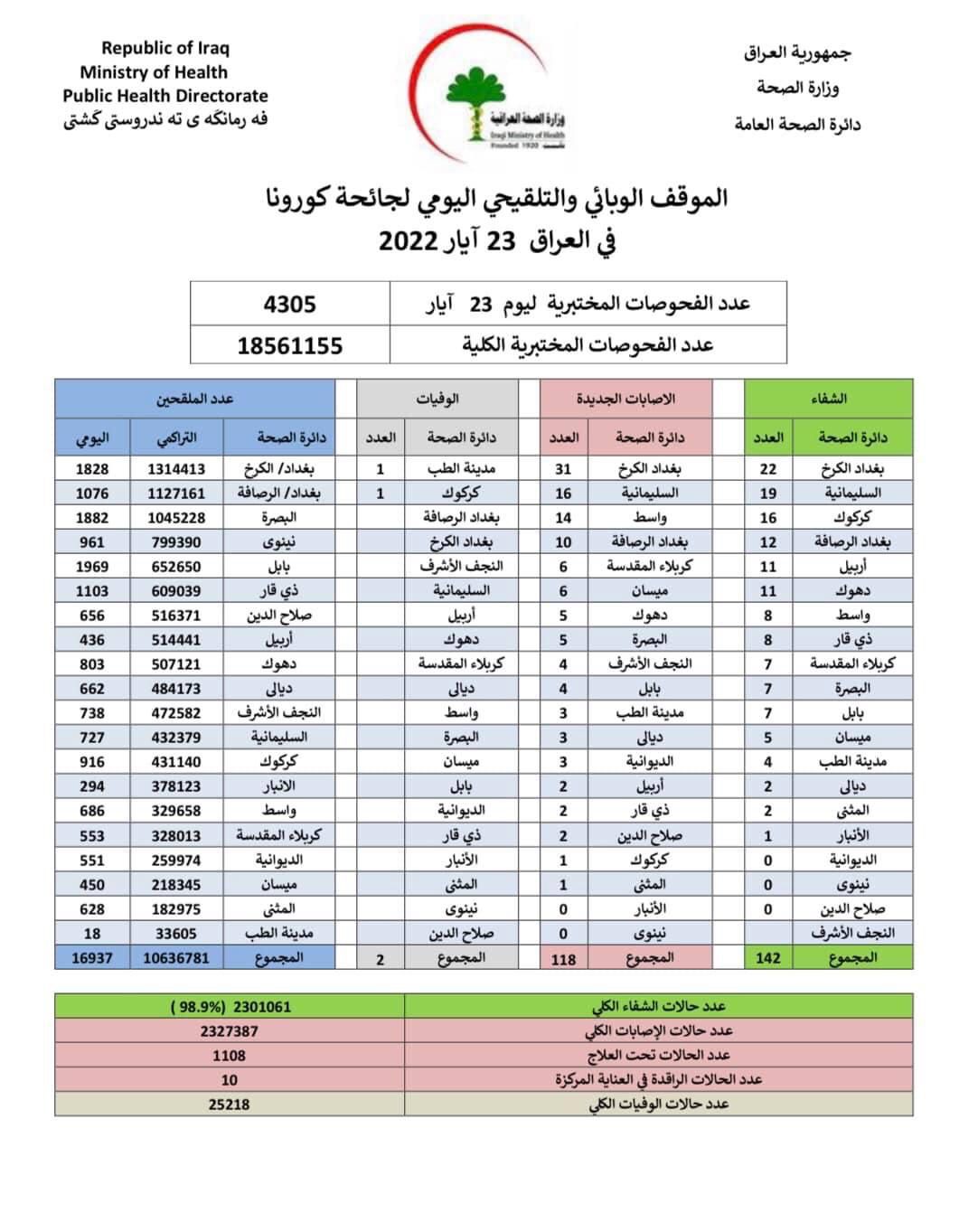 وأضافت، أن “الوفيات الجديدة بالفيروس بلغت حالتين في عموم البلاد”.
