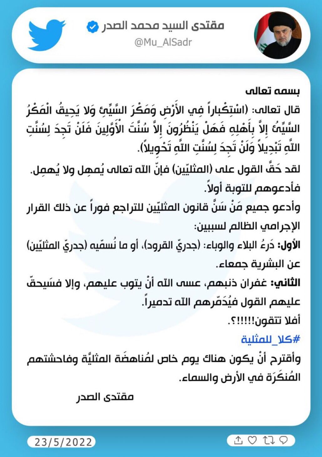 سياسةالسيد الصدر يدعو من سن قانون المثليين للتراجع قبل 4 سنوات 6 مشاهدات شارك الوسومالصدرقد يهمك أيضا أمن القبض على أب قام بتعنيف ابنته في ذي قار قبل 9 دقائق 4 مشاهدات رياضة عودة دي يونج ولوبيز.. فليك يحشد نجوم برشلونة لموقعة بيتيس قبل 13 دقيقة 3 مشاهدات عربي ودولي نائب إيراني: أميركا بعثت رسالة للتفاوض لكننا رفضنا قبل 42 دقيقة 7 مشاهدات أقتصاد طهران: العراقيون هم أكبر المشترين للعقارات في إيران ويستثمرون بمحطات الوقود وتعبئة التمور والزبيب قبل ساعة واحدة 8 مشاهدات أقتصاد مرصد: العجز المالي في العراق بلغ نحو 18 تريليون دينار حتى نهاية أيلول الماضي قبل ساعة واحدة 9 مشاهدات