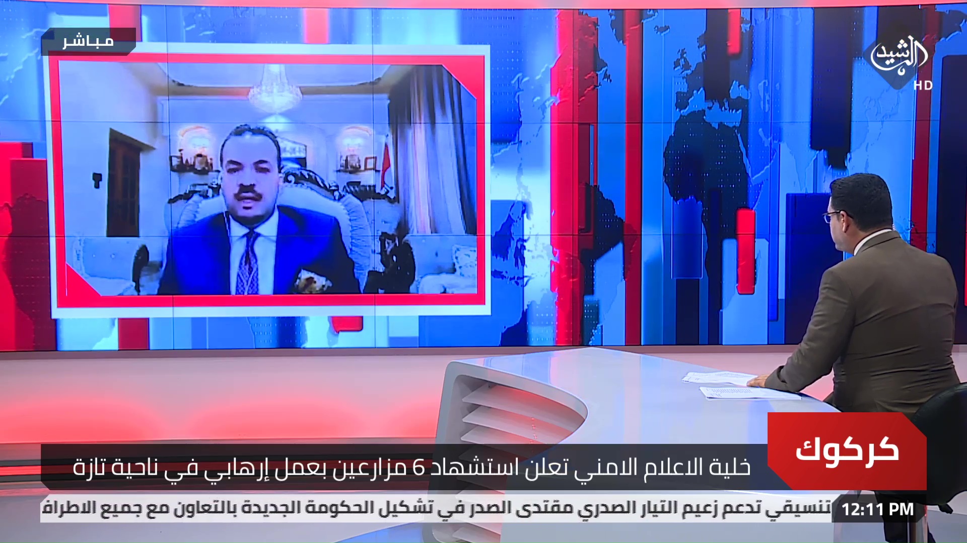 محلياتخلية الاعلام الامني تعلن استشهاد 6 مزارعين بعمل إرهابي في ناحية تازة عزام الحمداني / خبير امني قبل 4 سنوات 6 مشاهدات شارك الوسومالاعلام الامنيقد يهمك أيضا عربي ودولي تحذير مصري قطري تركي عاجل قبل انهيار هدنة غزة قبل 17 دقيقة 8 مشاهدات أمن الداخلية تعلن خلو العراق من أي مصانع للمخدرات أو محاولات لزراعتها قبل 60 دقيقة 5 مشاهدات سياسة السوداني ووفد الديمقراطي يؤكدان أهمية الإسراع بإنجاز الاستحقاقات الدستورية قبل ساعتين 5 مشاهدات محليات الأنواء الجوية: ضباب كثيف وانعدام الرؤية فجر وصباح غدٍ الأربعاء في الوسط والجنوب قبل ساعتين 8 مشاهدات سياسة "الرشيد" تنشر نص قرارات مجلس الوزراء في جلسة اليوم قبل 3 ساعات 17 مشاهدات