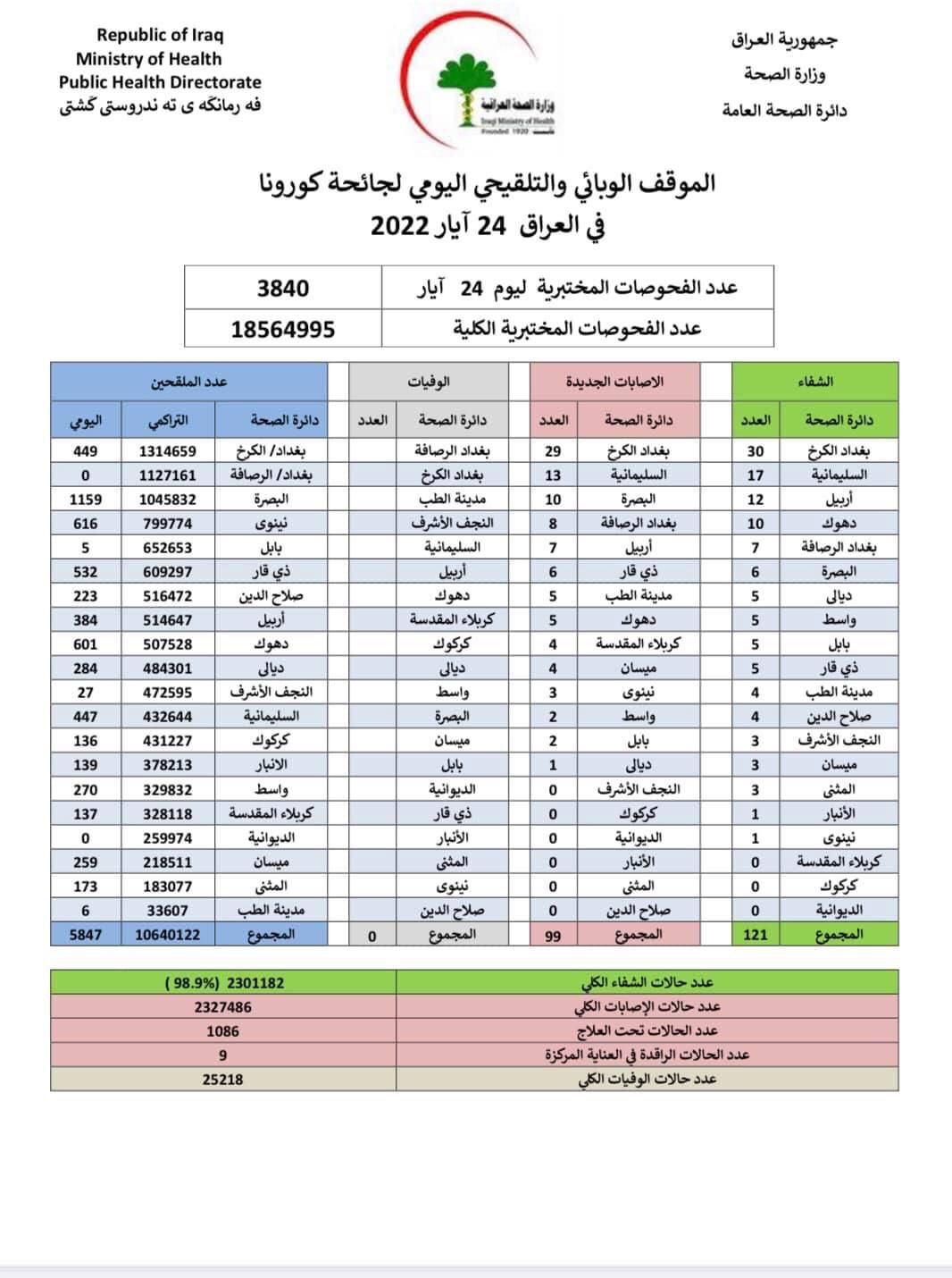 أعلنت وزارة الصحة، اليوم الثلاثاء، الموقف الوبائي اليومي لجائحة كورونا في عموم العراق.