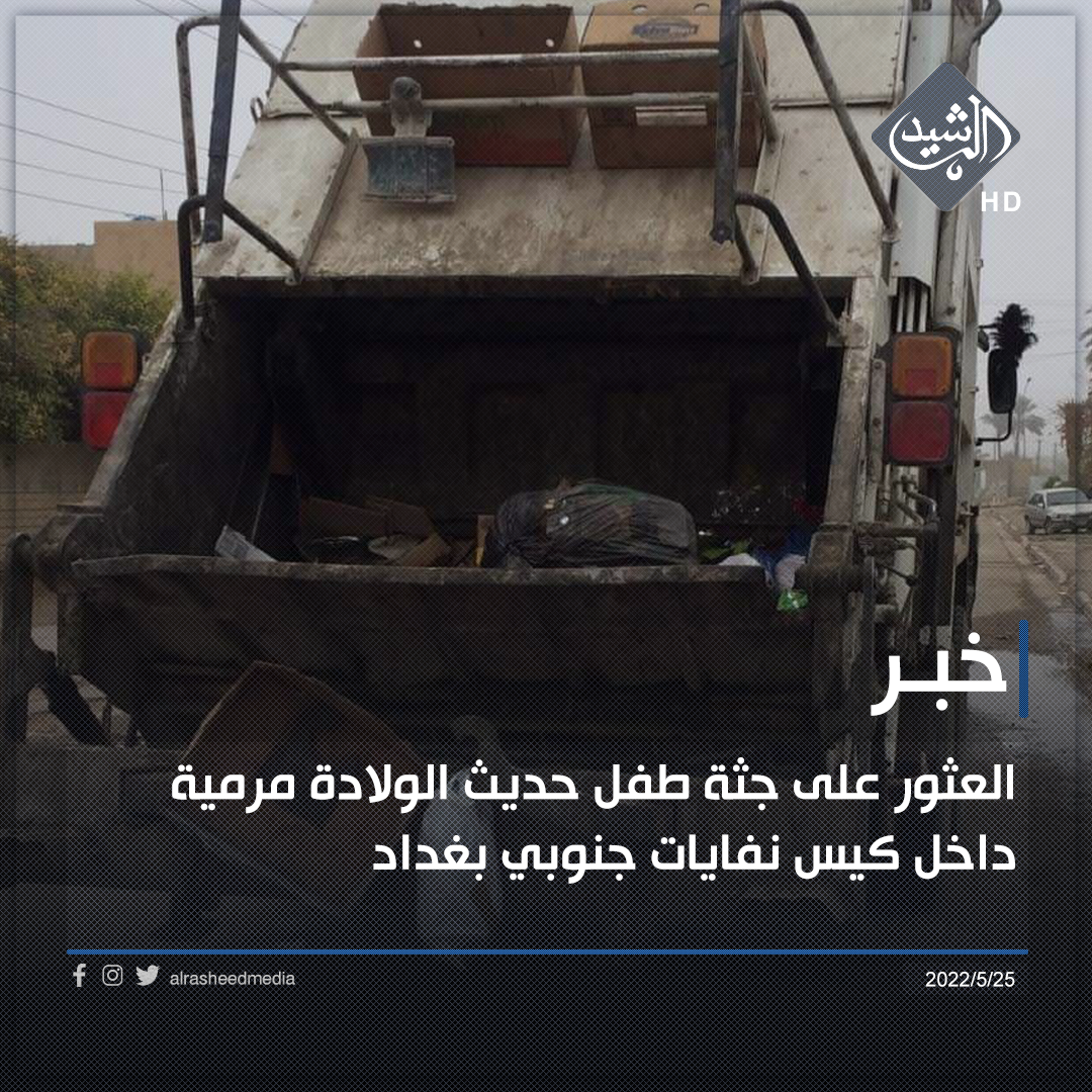 أفاد مصدر أمني، الاربعاء، بالعثور على جثة طفل حديث الولادة مرمية داخل مركبة نفايات جنوبي بغداد.