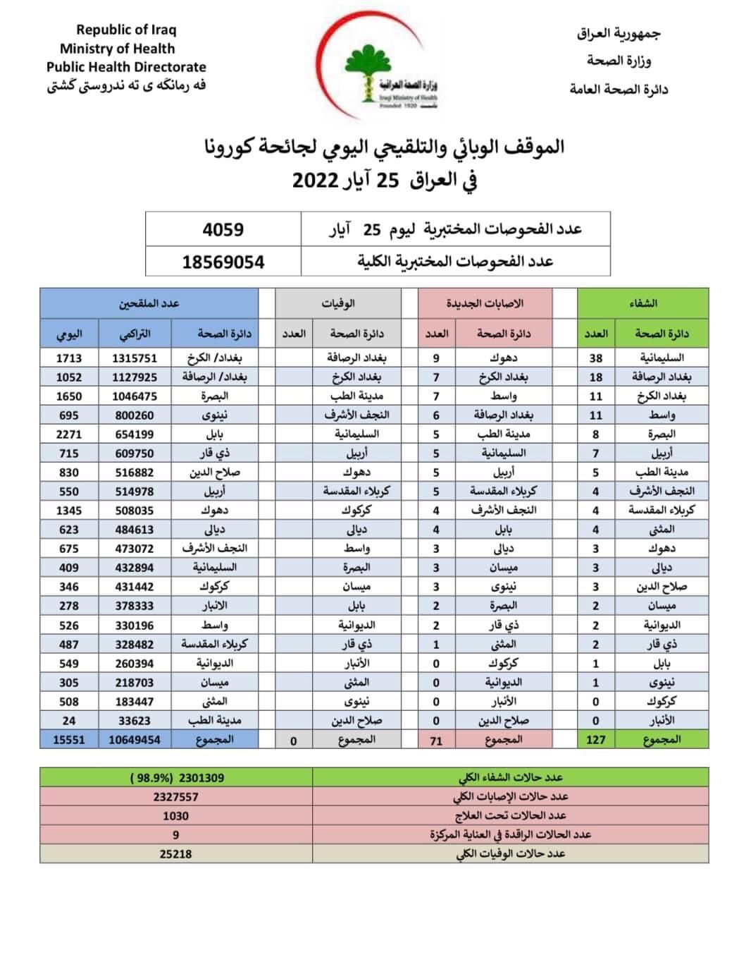 أعلنت وزارة الصحة، اليوم الاربعاء، الموقف الوبائي اليومي لجائحة كورونا في عموم العراق.