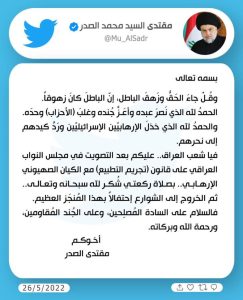 سياسةالسيد الصدر يوجه رسالة الى اعضاء مجلس النواب بشأن قانون تجريم التطبيع قبل 4 سنوات 6 مشاهدات شارك الوسومالصدرقد يهمك أيضا أمن القبض على أب قام بتعنيف ابنته في ذي قار قبل 11 دقيقة 4 مشاهدات رياضة عودة دي يونج ولوبيز.. فليك يحشد نجوم برشلونة لموقعة بيتيس قبل 14 دقيقة 3 مشاهدات عربي ودولي نائب إيراني: أميركا بعثت رسالة للتفاوض لكننا رفضنا قبل 43 دقيقة 8 مشاهدات أقتصاد طهران: العراقيون هم أكبر المشترين للعقارات في إيران ويستثمرون بمحطات الوقود وتعبئة التمور والزبيب قبل ساعة واحدة 9 مشاهدات أقتصاد مرصد: العجز المالي في العراق بلغ نحو 18 تريليون دينار حتى نهاية أيلول الماضي قبل ساعة واحدة 9 مشاهدات