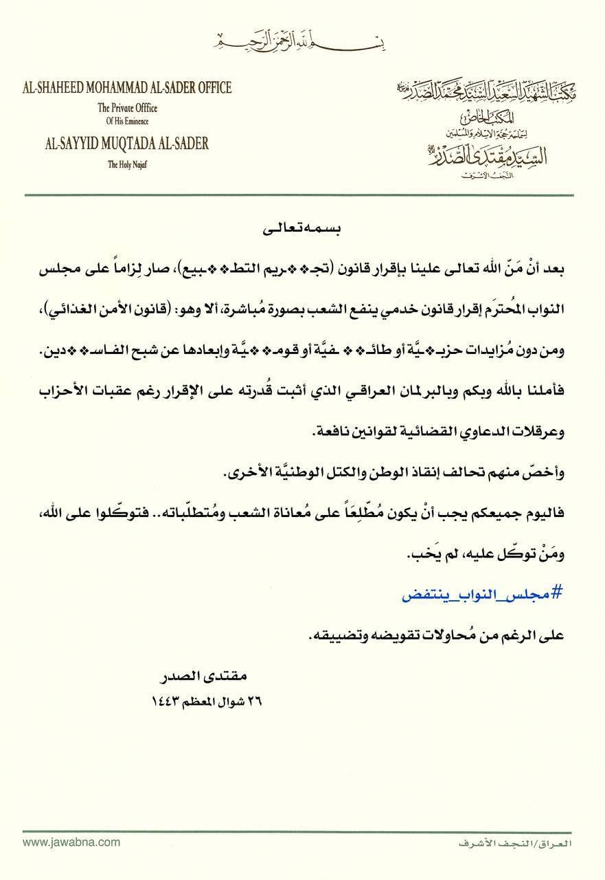 وقال السيد الصدر في بيان تلقته الرشيد : “بعد أن منَّ الله علينا بإقرار قانون (تجريم التطبيع) صار لزاماً على مجلس النواب المحترم إقرار قانون خدمي ينفع الشعب بصورة مباشرة ،إلا وهو (قانون الأمن الغذائي) ومن دون مزايدات حزبية وطائفية أو قومية وابعاده عن شبح الفاسدين، فأملنا بالله وبكم وبالبرلمان العراقي الذي أثبت قدرته على الإقرار بالرغم من عقبات الأحزاب وعرقلات الدعاوى القضائية لقوانين نافعة ،وأخص منهم تحالف إنقاذ وطن والكتل الوطنية الأخرى”.