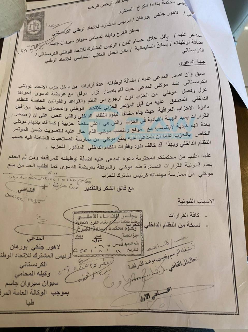واظهرت وثائق تداولتها وسائل اعلام كردية، ان “شيخ جنكي رفع دعوى قضائية على ابن عمه رئيس حزب الاتحاد الوطني الكردستاني بافل طالباني، في محكمة استئناف بغداد/ الكرخ، بتهمة مخالفة النظام الداخلي للحزب، من خلال عزل الاخير لشيخ جنكي ومنعه من ممارسة مهامه”.