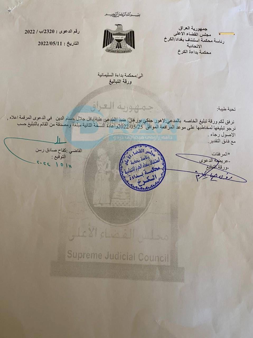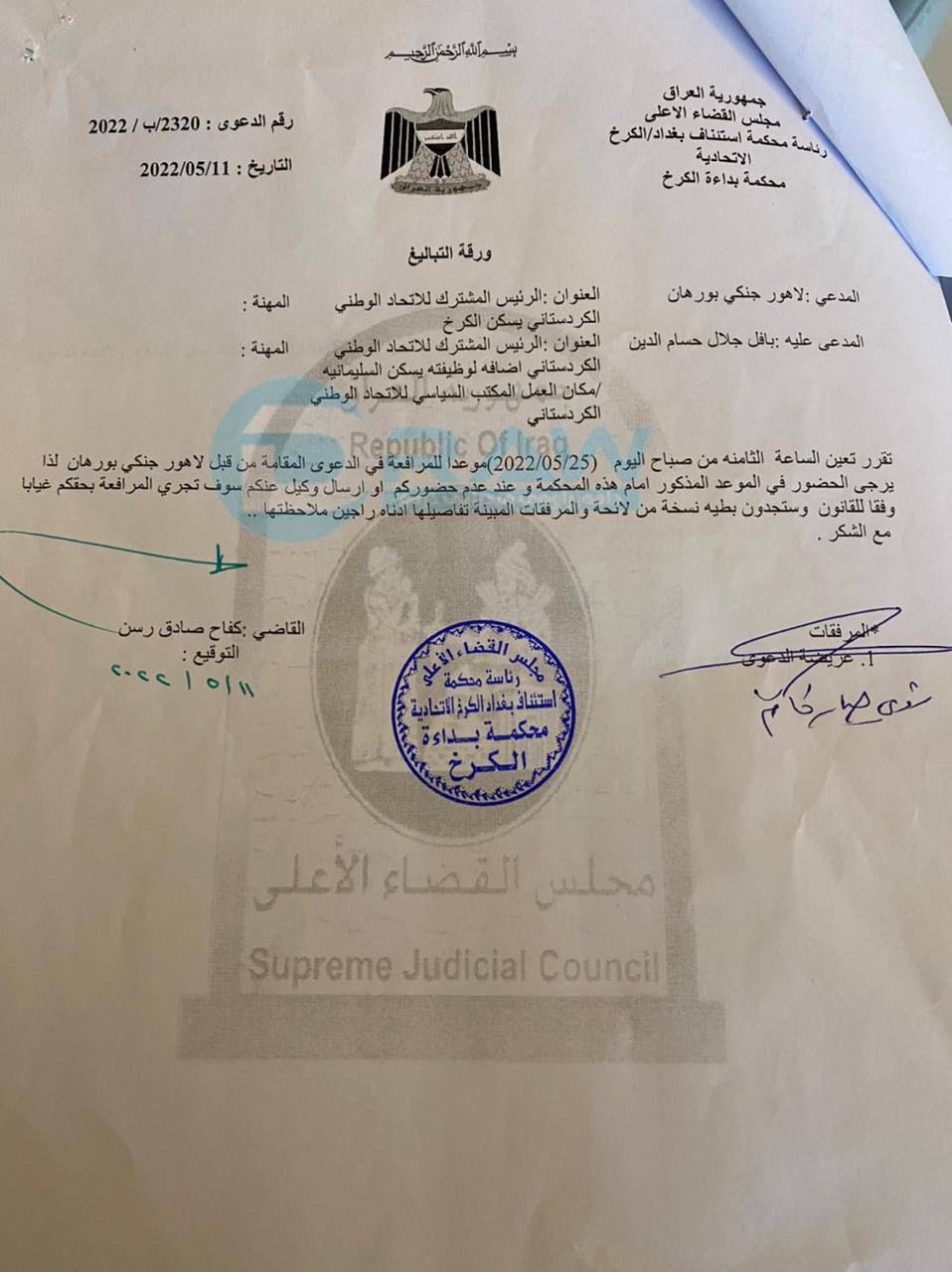 اقام الرئيس المشترك السابق لحزب الاتحاد الوطني الكردستاني لاهور شيخ جنكي، دعوى قضائية على رئيس الحزب بافل طالباني في احدى محاكم بغداد.