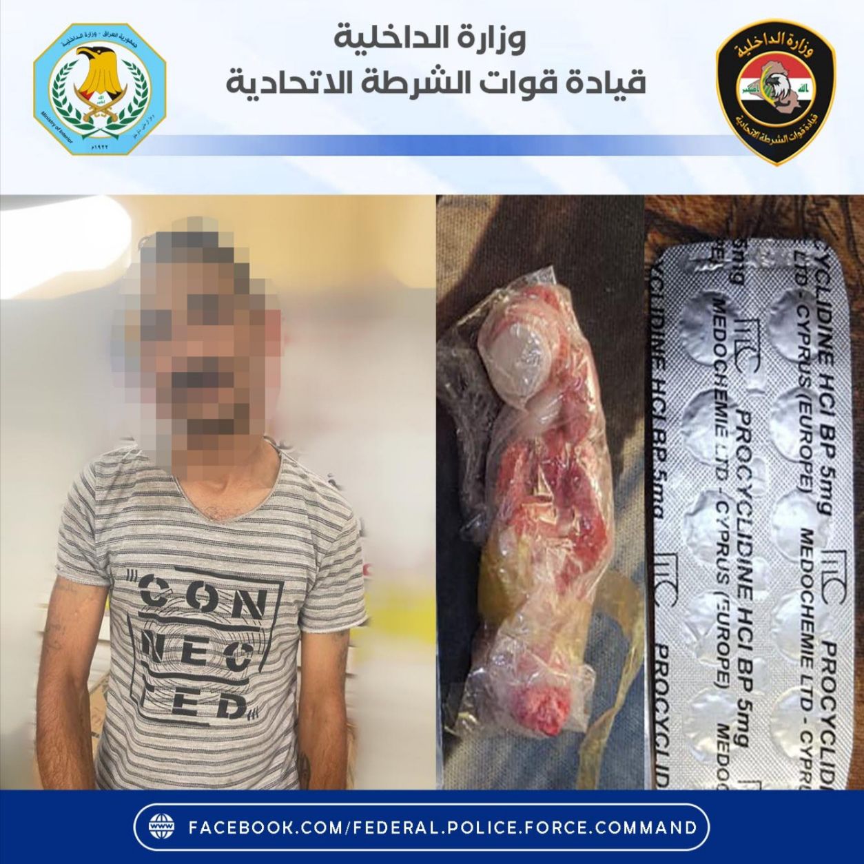 واضافت، ان “قوة من اللواء الثامن الفرقة الثانية شرطة اتحادية بالاشتراك مع مفارز استخبارات اللواء ، تمكنت من إلقاء القبض على متهم في منطقة (التاجي) شمال بغداد ، وضبط بحوزته 24 حبة مخدرة ، حيث تمت عملية إلقاء القبض عن طريق تنفيذ ممارسة أمنية وتفتيش العجلات والأشخاص”.