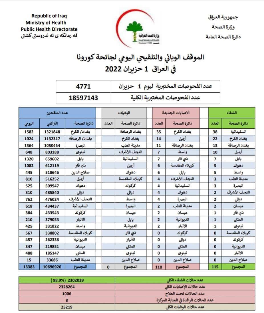 وقالت الوزارة، في بيان تلقته الرشيد، أنه “تم تسجيل 110 إصابة جديدة بفيروس كورونا، و 115 حالة شفاء من المرض، دون وفيات”.
