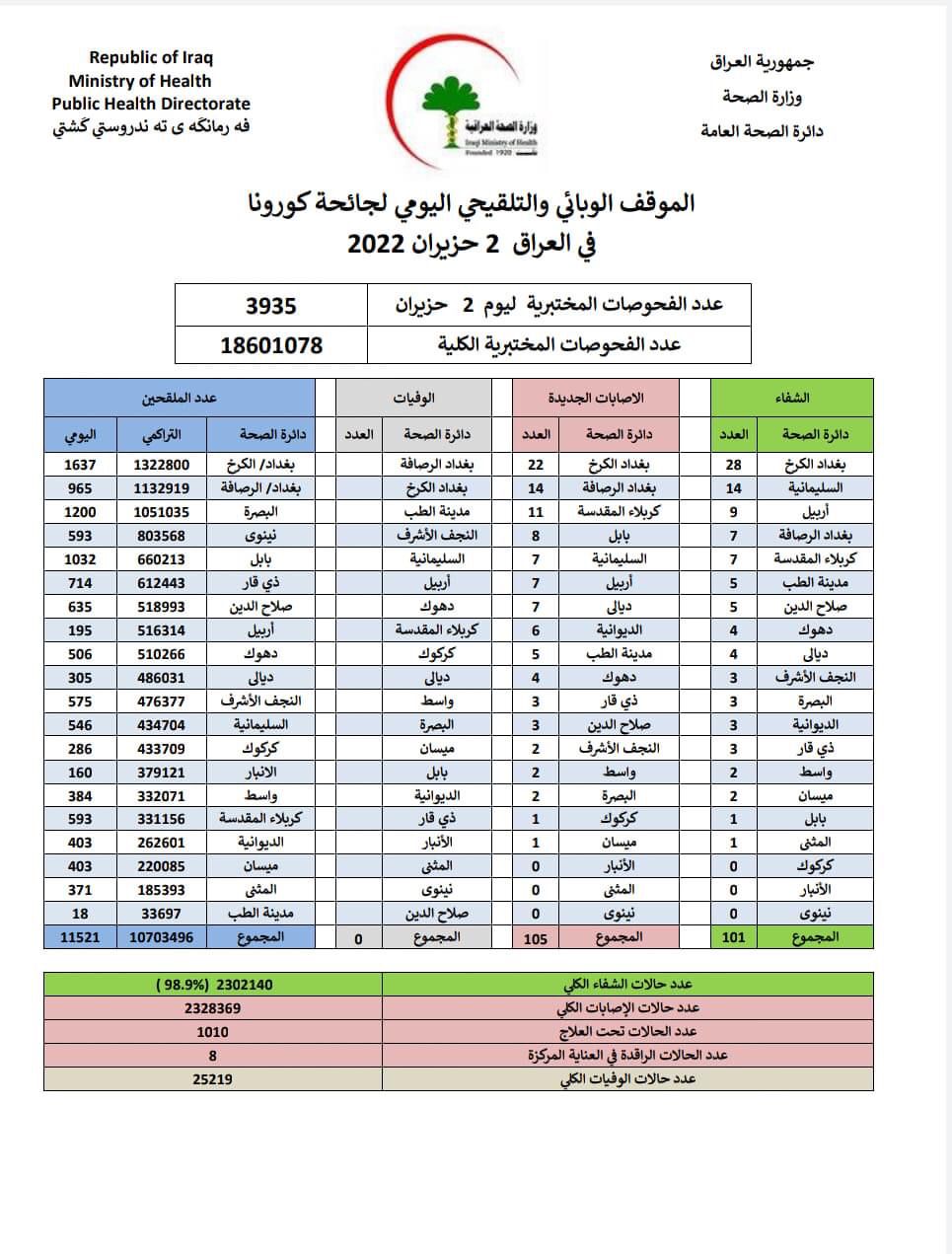 وقالت الوزارة، في بيان تلقته الرشيد، أنه “تم تسجيل 105 إصابة جديدة بفيروس كورونا، و 101 حالة شفاء من المرض، دون وفيات”.