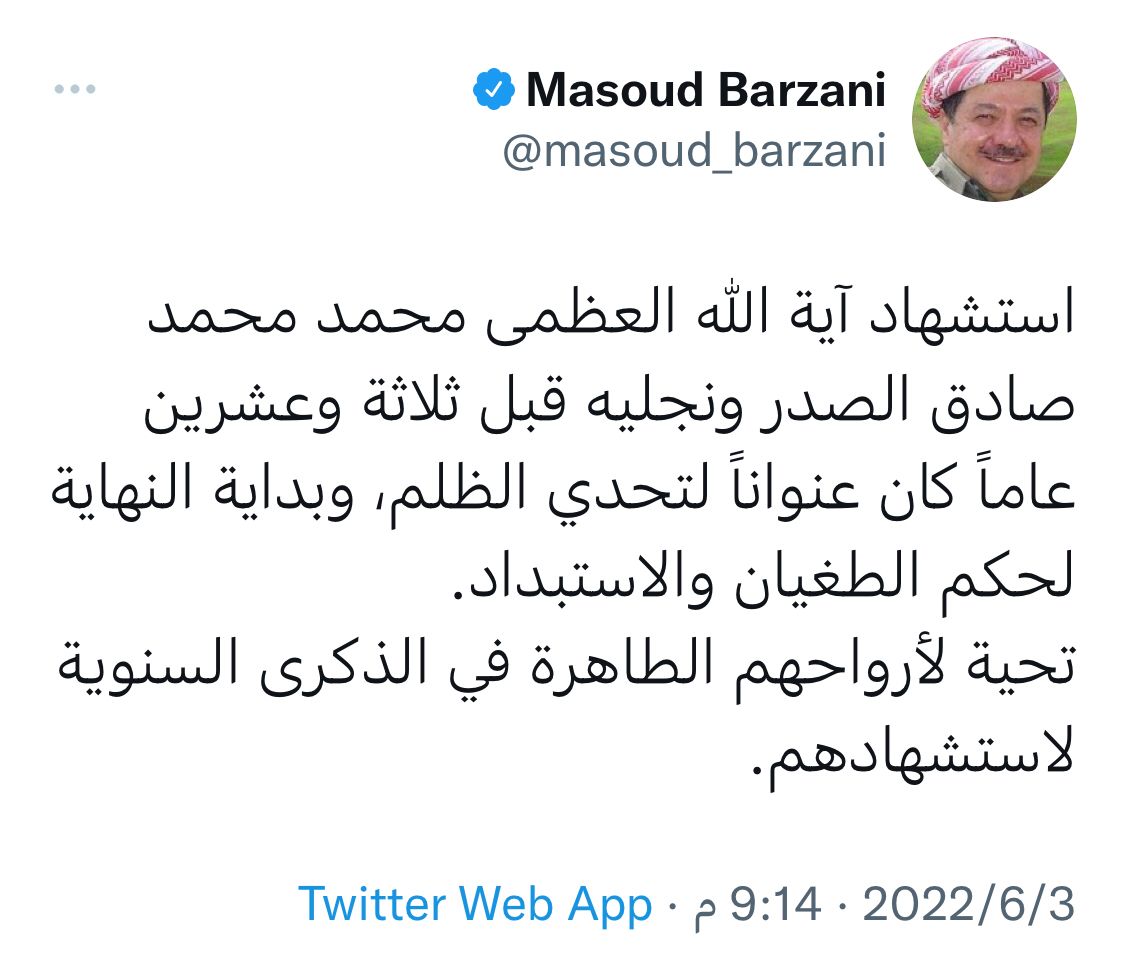 سياسةبارزاني: استشهاد السيد الصدر ونجليه عنوان لتحدي الظلم وبداية النهاية لحكم الطغيان قبل 4 سنوات 2 مشاهدات شارك الوسومالصدرمسعود بارزانيقد يهمك أيضا سياسة العراق يطلب من الأغذية العالمي زيادة الدعم الدولي المخصص له بمجال الأمن الغذائي المستدام قبل 4 دقائق 1 مشاهدة عربي ودولي بري لوفد مجلس الأمن: لن نتفاوض تحت النار وسلاح حزب الله شأن داخلي قبل 18 دقيقة 4 مشاهدات أمن الاستخبارات العسكرية تحبط عملية تهريب مواد صناعية وغذائية إلى ديالى قبل 56 دقيقة 8 مشاهدات عربي ودولي قسد تمنع إقامة أي احتفالات بسقوط نظام الأسد في مناطقها قبل ساعة واحدة 7 مشاهدات أمن السيد الصدر يوجه سرايا السلام بشأن تهريب الأسلحة: نسقوا مع الجهات المختصة..فلعل هناك خرقاً وتواطؤاً قبل ساعتين 9 مشاهدات