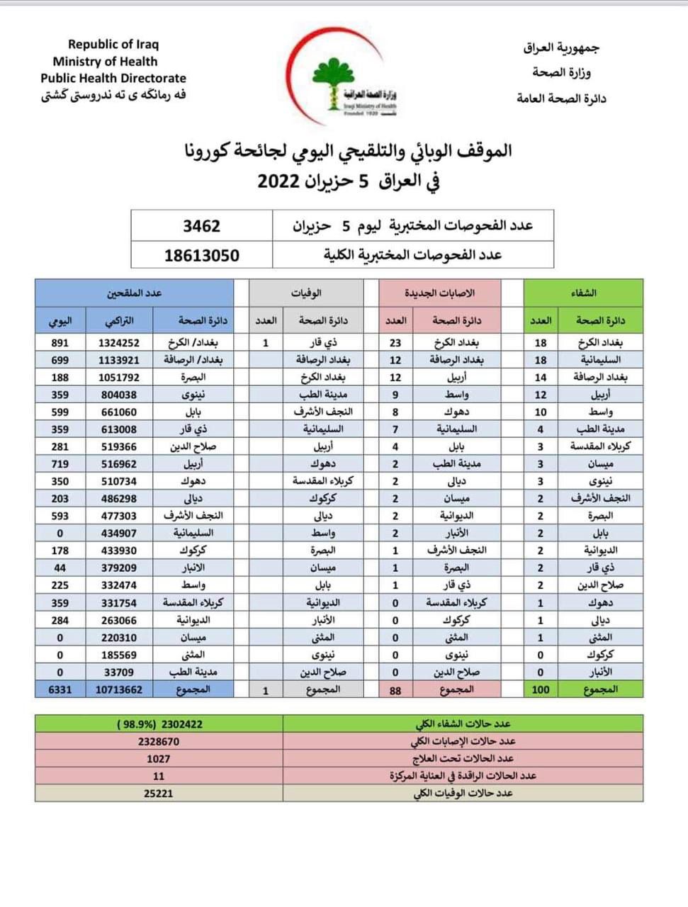 أعلنت وزارة الصحة، اليوم الاحد، الموقف الوبائي اليومي لجائحة كورونا في عموم العراق.