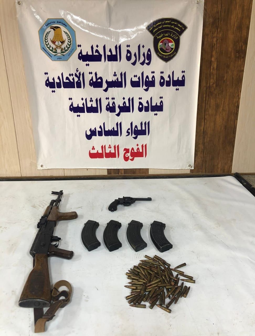 واضافت، ان “قوة من اللواء السادس الفرقة الثانية شرطة اتحادية مسنودة بالجهد الاستخباري نفذت عملية تفتيش على السلاح غير المرخص في منطقة (الرفاق) غربي بغداد، تم خلالها العثور على بندقية كلاشنكوف ومسدس، 4 مخزن بندقية، 85 إطلاقة بندقية،