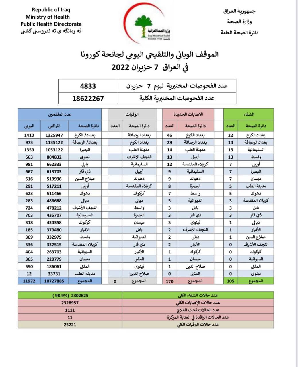 وقالت الوزارة، في بيان تلقته الرشيد، أنه “تم تسجيل 170 إصابة جديدة بفيروس كورونا، و 105 حالة شفاء من المرض، دون وفيات”.