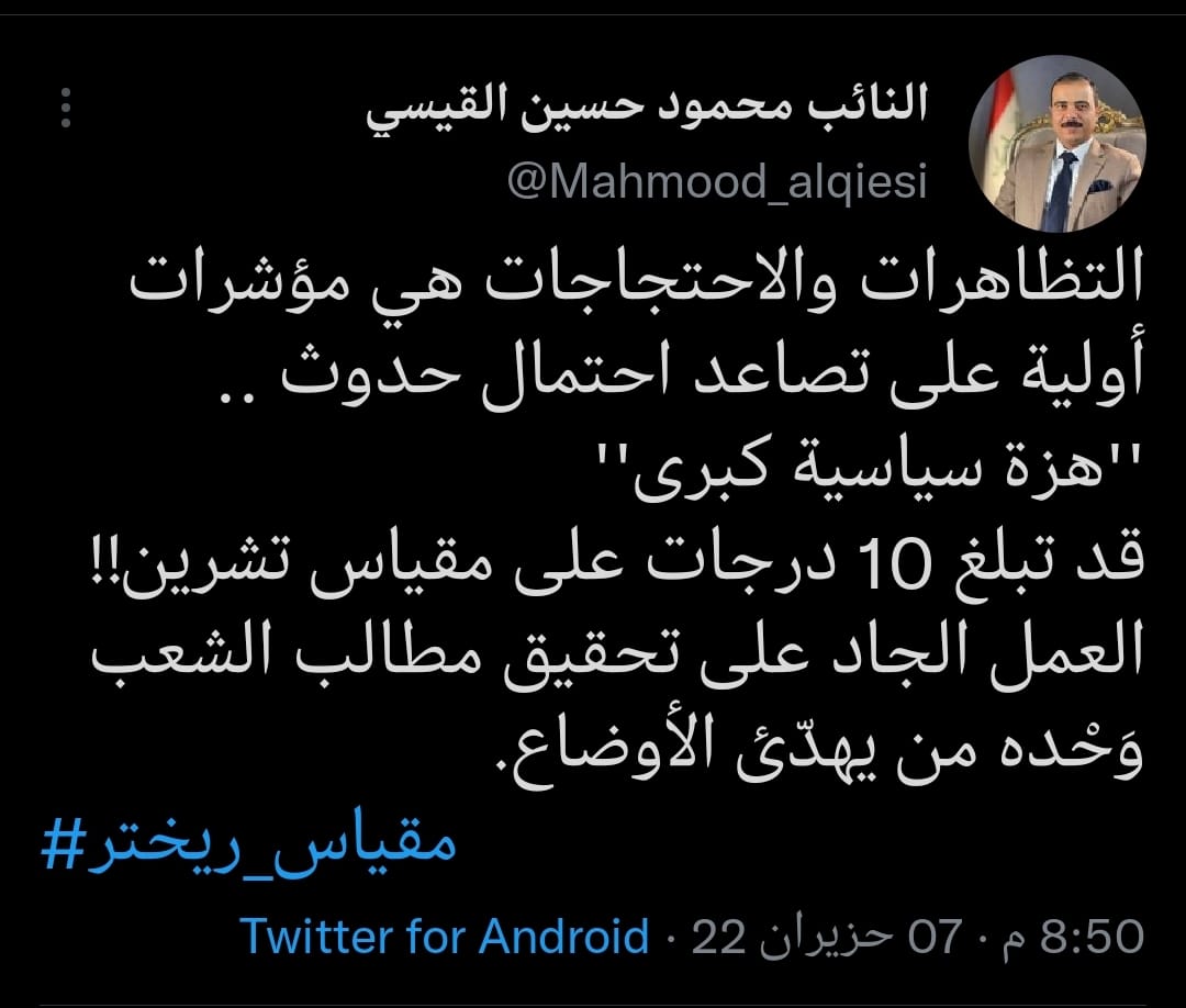 سياسةالقيسي: التظاهرات والاحتجاجات هي مؤشرات اولية لاحتمال حدوث هزة سياسية كبرى قبل 3 سنوات 4 مشاهدات شارك الوسومتظاهراتقد يهمك أيضا رياضة أحدهم من فنربخشة وآخر من غلطة سراي.. اعتقال 27 لاعبًا بالدوري التركي بقضية "المراهنات" قبل 10 دقائق 2 مشاهدات عربي ودولي فرنسا.. محاكمة عراقيين وسوداني إثر حادث غرق مركب مهاجرين خلف قتلى في قناة المانش قبل 41 دقيقة 6 مشاهدات عربي ودولي صحيفة عبرية: ارتفاع غير مسبوق في حالات انتحار الجنود الإسرائيليين بعد حرب غزة قبل 52 دقيقة 6 مشاهدات عربي ودولي الكرملين: إن لم نحقق أهدافنا بالطرق السلمية سنواصل عمليتنا العسكرية في أوكرانيا قبل ساعة واحدة 8 مشاهدات رياضة قائد السودان قبل مواجهة العراق: نتجاوز فواجع الحرب بكرة القدم والفوز "يوم عيد" قبل ساعتين 10 مشاهدات