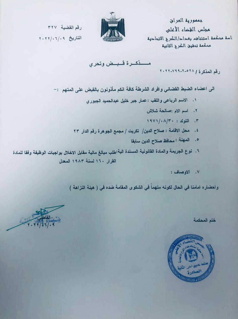 محلياتالقضاء يصدر مذكرة قبض بحق محافظ صلاح الدين السابق عمار الجبوري (وثيقة) قبل 3 سنوات 20 مشاهدات شارك الوسومصلاح الدينعمار الجبوريقد يهمك أيضا عربي ودولي حماس: وافقنا على تشكيل لجنة تكنوقراط لحكم غزة قبل 5 دقائق 2 مشاهدات رياضة عرض سعودي ضخم لضم رافينيا يربك حسابات برشلونة قبل 9 دقائق 3 مشاهدات محليات الصحة: نصف النزلاء في مستشفى الرشاد متماثلون للشفاء لكن ذويهم يرفضون استلامهم قبل 35 دقيقة 7 مشاهدات عربي ودولي مقربون يكشفون: بشار الأسد تأقلم واستسلم للمنفى وشقيقه ماهر لم يتقبل فكرة فقدان السلطة قبل 39 دقيقة 6 مشاهدات عربي ودولي برّي يحذر من استمرار العدوان الإسرائيلي: لا يجوز ومن غير المقبول التفاوض تحت النار قبل 54 دقيقة 6 مشاهدات