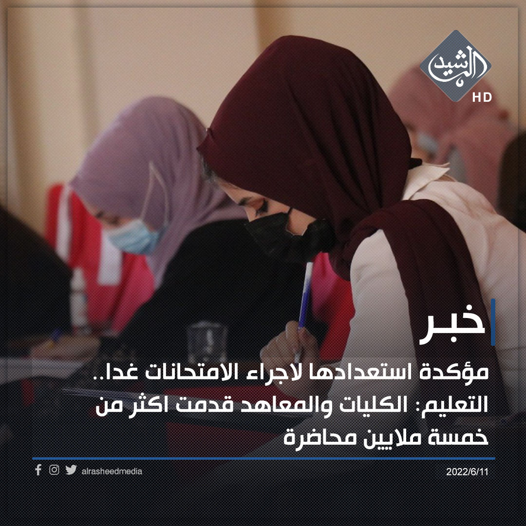 وذكرت الوزارة في بيان تلقته الرشيد، انه”عملا بتوقيتات التقويم الجامعي للعام الدراسي 2022/2021 واستكمالا لمتطلبات وآليات التعليم المدمج التي قدمت فيها الطواقم التدريسية في الكليات والمعاهد خمسة ملايين وستا وسبعين محاضرة علمية في التخصصات الطبية والصحية والطب البيطري والتخصصات الهندسية والعلمية والإنسانية كافة، تستعد الجامعات الحكومية والأهلية غدا الأحد الموافق 2020/6/12 لأداء الامتحانات النهائية الفصلية والسنوية حسب الأنظمة الدراسية المعتمدة في المؤسسات الجامعية فيما تواصل عدد من الجامعات والكليات اختباراتها النهائية التي انطلقت قبل أسبوع استنادا الى الصلاحيات المخولة لها بتقديم موعد الامتحانات”.