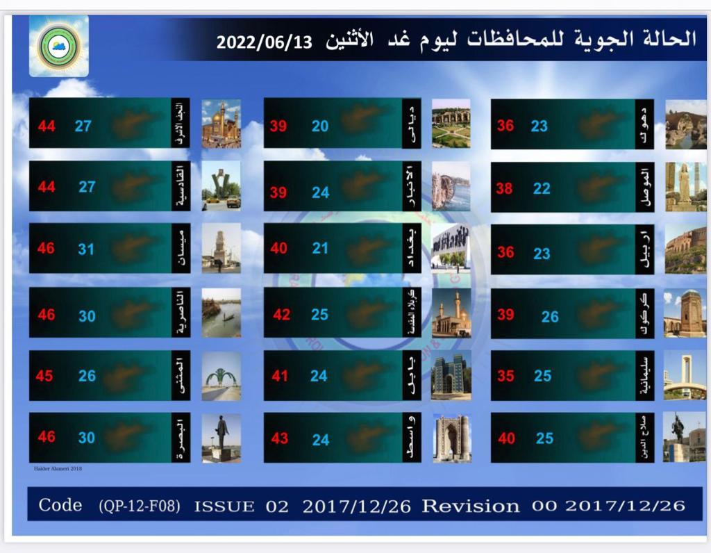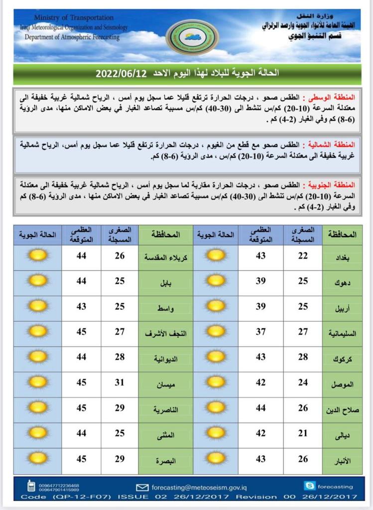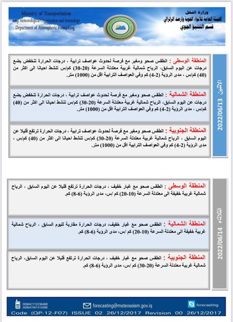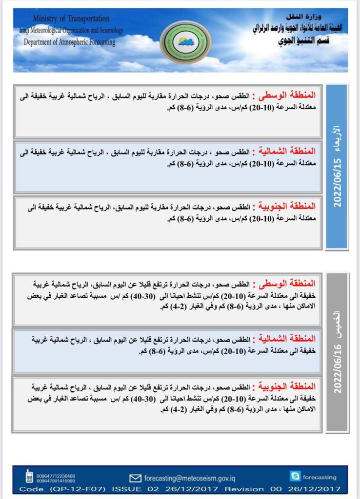 محلياتطقس العراق خلال الايام المقبلة: ارتفاع الحرارة وعواصف ترابية قبل 3 سنوات 3 مشاهدات شارك اعلنت هيئة الانواء الجوية، حالة طقس العراق خلال الايام المقبلة، فيما اشارت الى ارتفاع بالحرارة وعواصف ترابية. الوسومطقس العراققد يهمك أيضا رياضة قرعة المونديال تضع الفائز من مباراة الملحق العالمي لمنتخبنا إلى جانب فرنسا والنرويج والسنغال قبل 27 ثانية رياضة منتخب المغرب يقع في مجموعة البرازيل وانجلترا تصطدم بكرواتيا في قرعة المونديال قبل 20 دقيقة 6 مشاهدات رياضة حدث تاريخي.. 3 رؤساء دول يشاركون في سحب قرعة المونديال قبل 33 دقيقة 5 مشاهدات عربي ودولي قرار جديد من مجموعة السبع والاتحاد الأوروبي: فرض حظر كامل على النفط الروسي قبل 47 دقيقة 6 مشاهدات رياضة الفيفا يمنح جائزة السلام 2025 لدونالد ترامب قبل ساعة واحدة 7 مشاهدات
