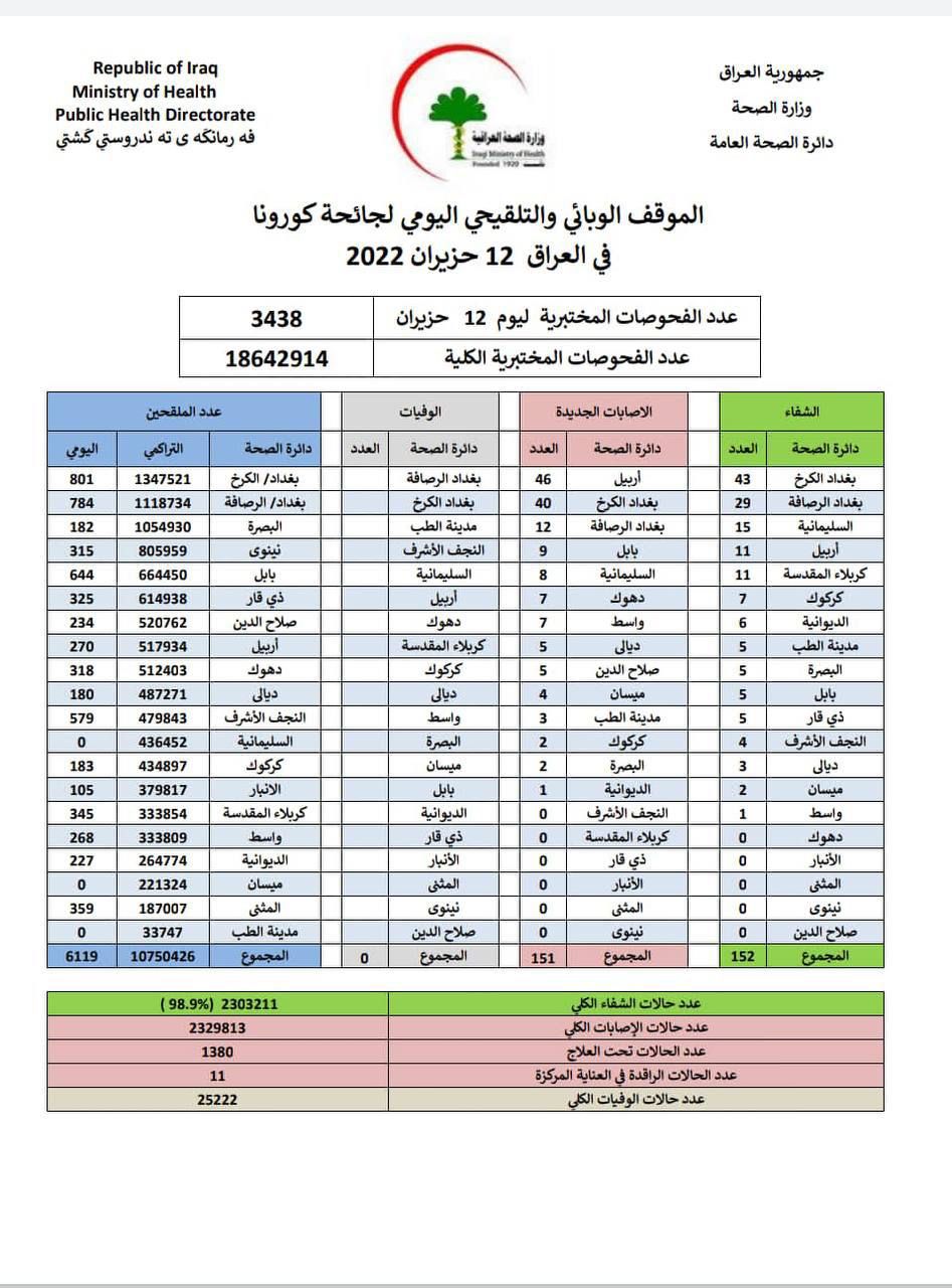أعلنت وزارة الصحة، اليوم الاحد، الموقف الوبائي اليومي لجائحة كورونا في عموم العراق.
