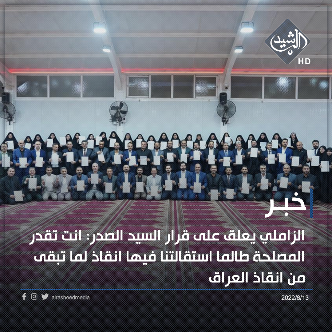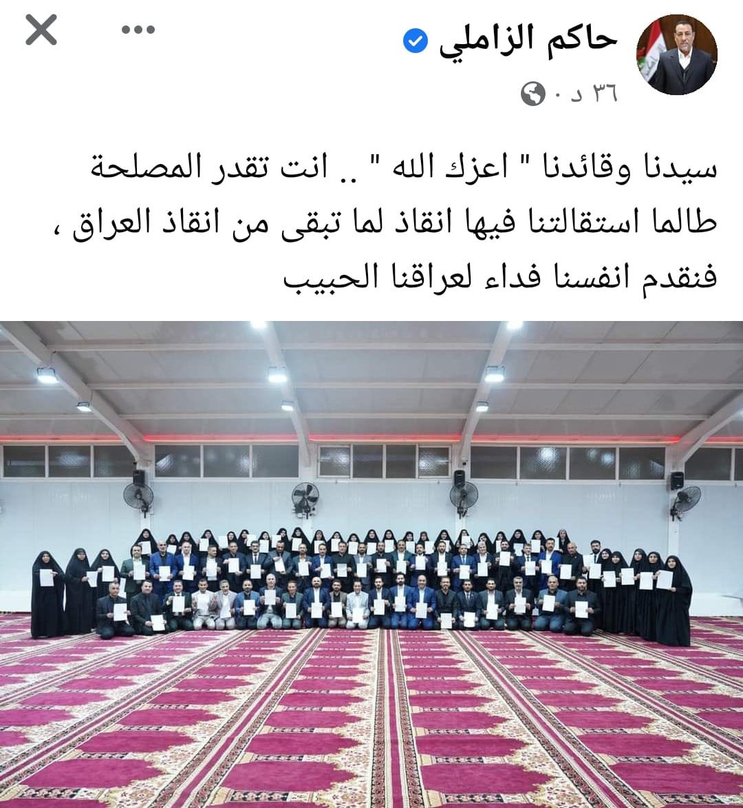 وقال الزاملي، في منشور على الفيسبوك تابعته “الرشيد”، “سيدنا وقائدنا ” اعزك الله ” .. انت تقدر المصلحة طالما استقالتنا فيها انقاذ لما تبقى من انقاذ العراق ، فنقدم انفسنا فداء لعراقنا الحبيب”.