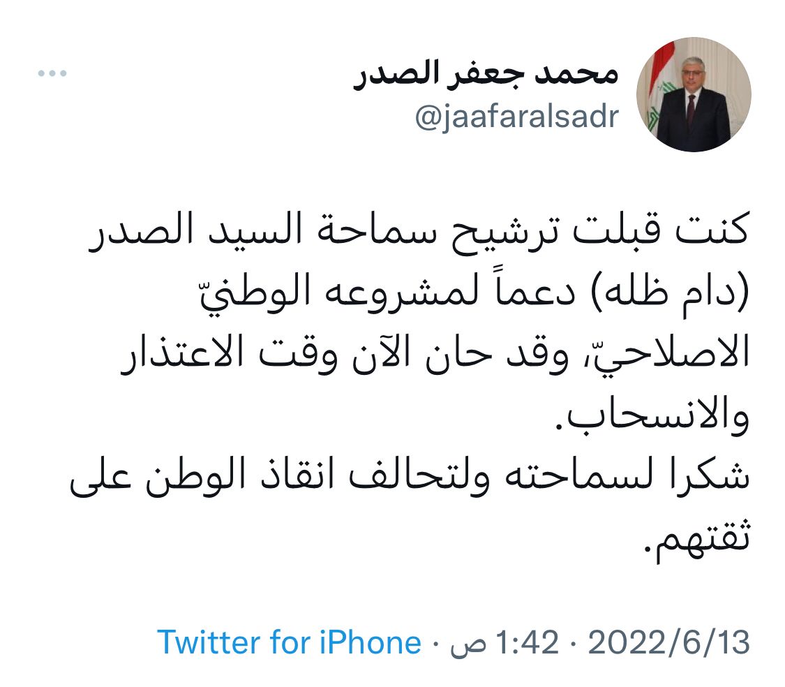 وقال الصدر، في تغريدة على تويتر تابعتها “الرشيد”، “كنت قبلت ترشيح سماحة السيد الصدر (دام ظله) دعماً لمشروعه الوطنيّ الاصلاحيّ، وقد حان الآن وقت الاعتذار والانسحاب”.