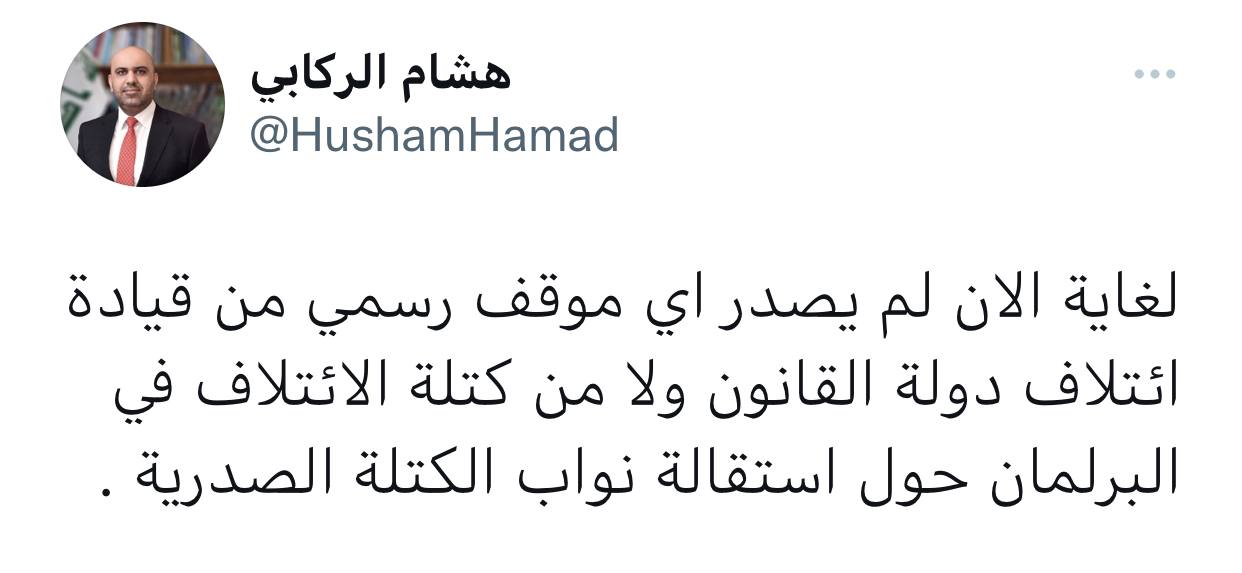 وقال المتحدث باسم المكتب هشام الركابي في تغريدة عبر تويتر طالعتها الرشيد، انه”لغاية الان لم يصدر اي موقف رسمي من قيادة ائتلاف دولة القانون ولا من كتلة الائتلاف في البرلمان حول استقالة نواب الكتلة الصدرية”.