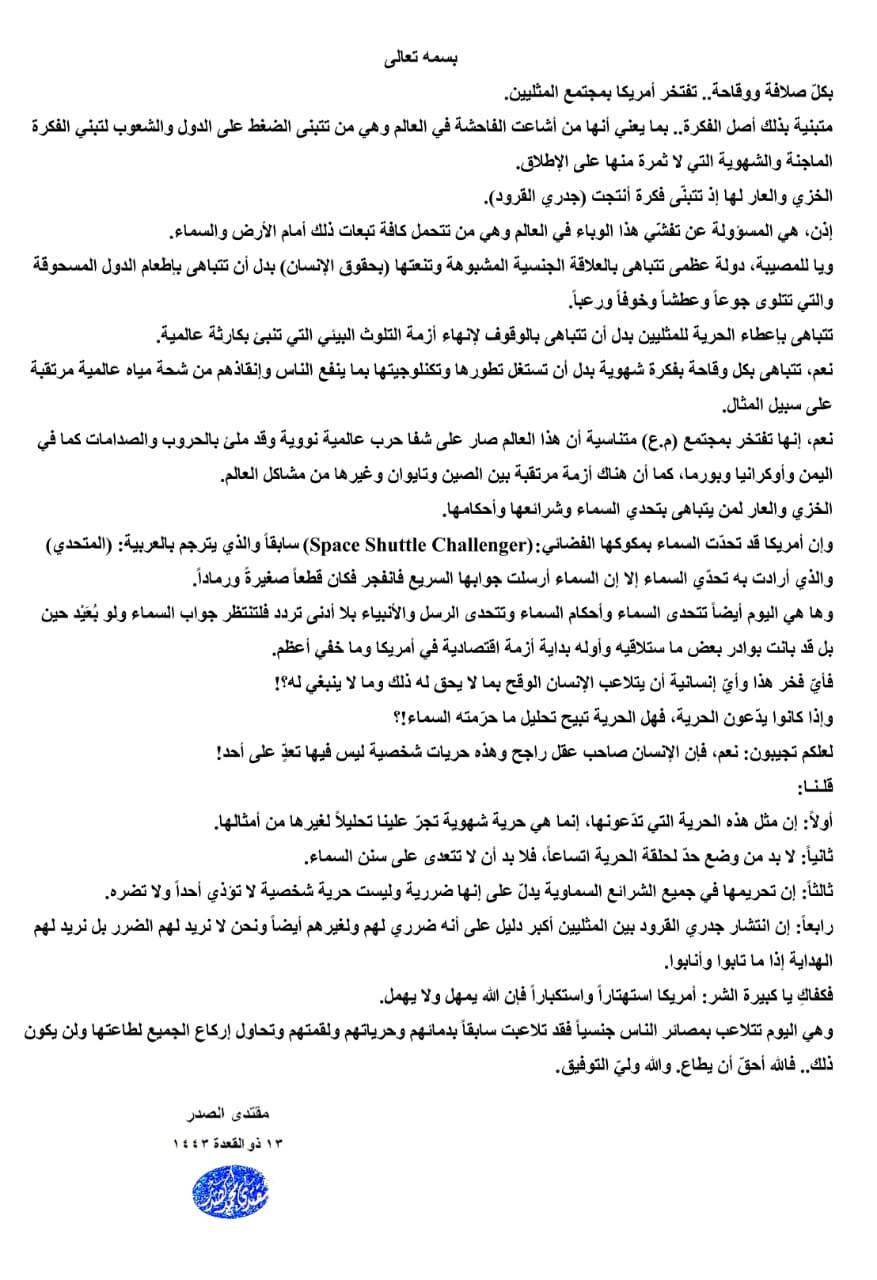 سياسةالسيد الصدر: بكل صلافة ووقاحة تفتخر امريكا بمجتمع المثليين قبل 3 سنوات 4 مشاهدات شارك الوسومالصدرالمثليينقد يهمك أيضا علوم وتكنولوجيا خلل فني يوقف عمل منصات ومواقع عالمية على الإنترنت قبل 21 دقيقة 4 مشاهدات عربي ودولي نعيم قاسم: ننتظر من الحكومة اللبنانية أن تبين لنا بطولاتها بإيقاف العدوان وتحرير الأسرى والإعمار قبل 29 دقيقة 5 مشاهدات رياضة أخطاء كارثية وكرات ساخنة.. كوابيس الماضي تحاصر قرعة كأس العالم قبل 40 دقيقة 4 مشاهدات عربي ودولي حماس: وافقنا على تشكيل لجنة تكنوقراط لحكم غزة قبل 51 دقيقة 9 مشاهدات رياضة عرض سعودي ضخم لضم رافينيا يربك حسابات برشلونة قبل 55 دقيقة 5 مشاهدات