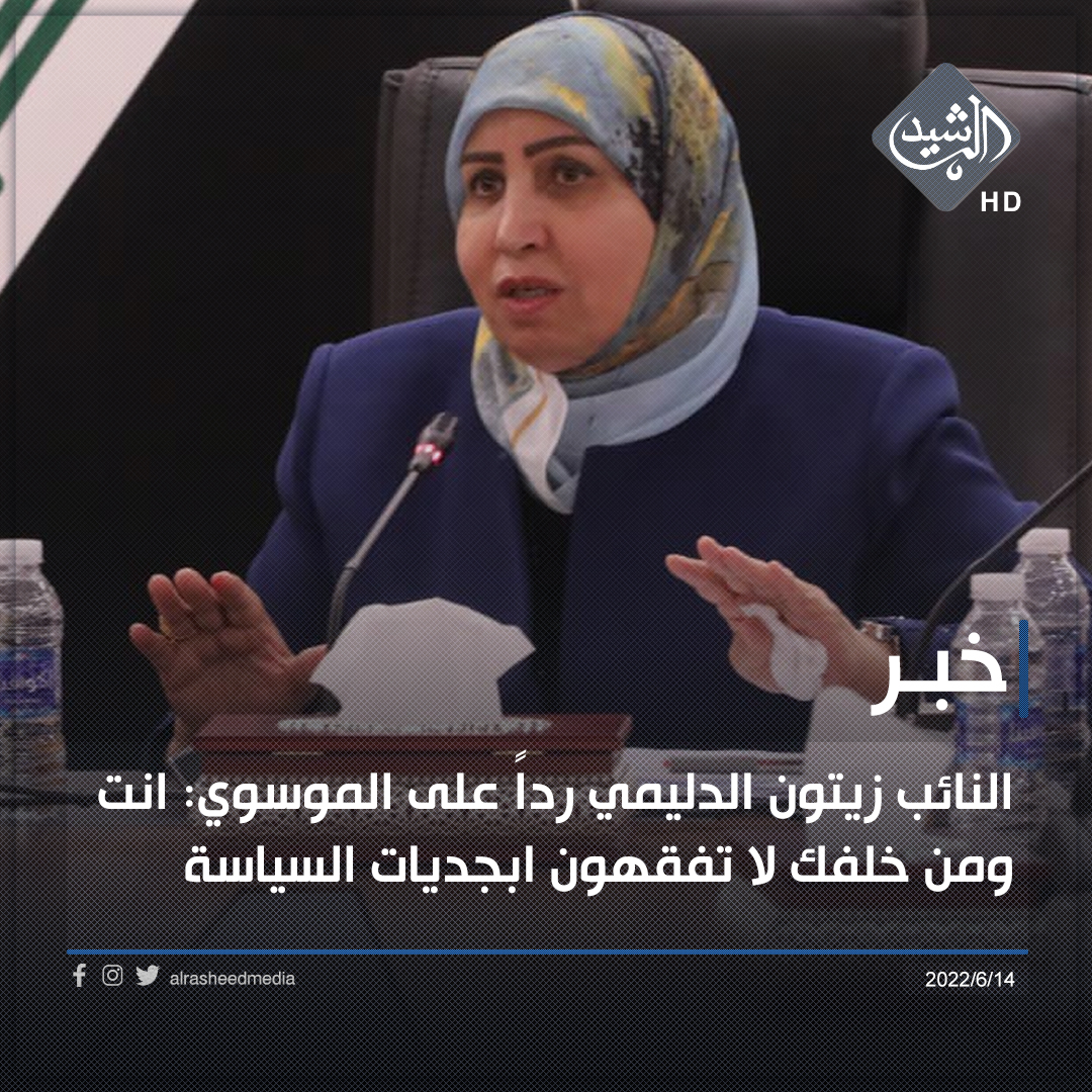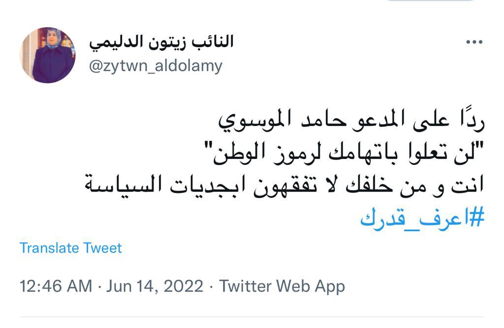 وذكرت الدليمي، في تغريدة على تويتر، تابعته “الرشيد”، “رداً على المدعو حامد الموسوي: لن تعلو باتهامك لرموز الوطن، انت ومن خلفك لا تفقهون ابجديات السياسة”.