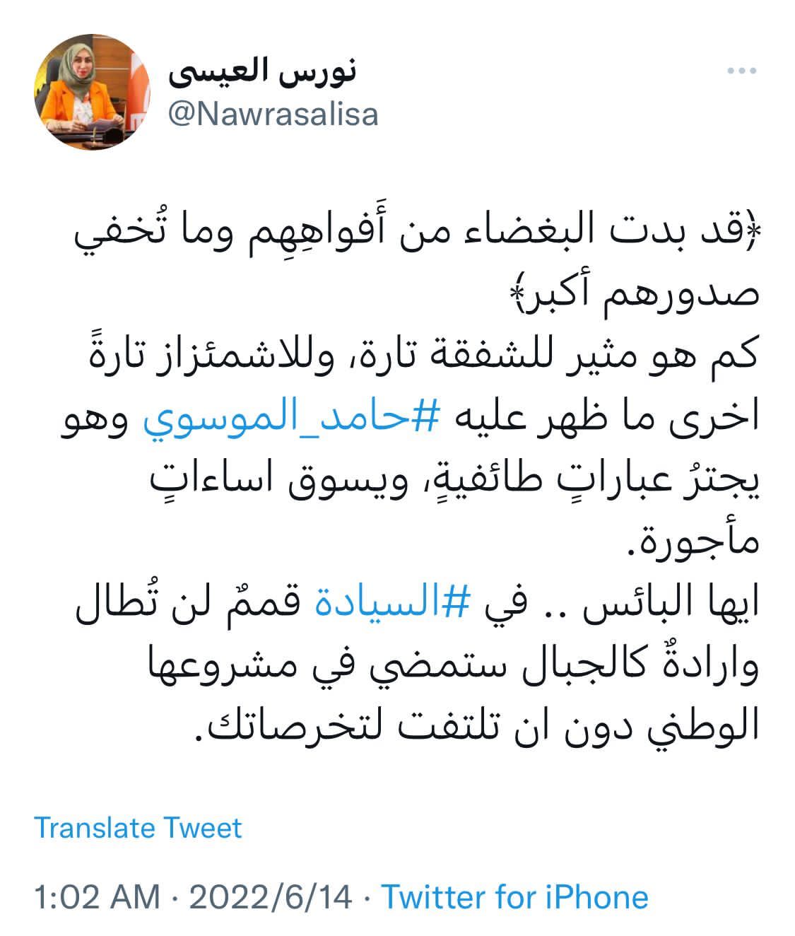 وذكرت العيسى، في تغريدة على تويتر، تابعتها “الرشيد”، “قد بدت البغضاء من أَفواهِهِم وما تُخفي صدورهم أكبر كم هو مثير للشفقة تارة، وللاشمئزاز تارةً اخرى ما ظهر عليه، حامد الموسوي وهو يجترُ عباراتٍ طائفيةٍ، ويسوق اساءاتٍ مأجورة”.