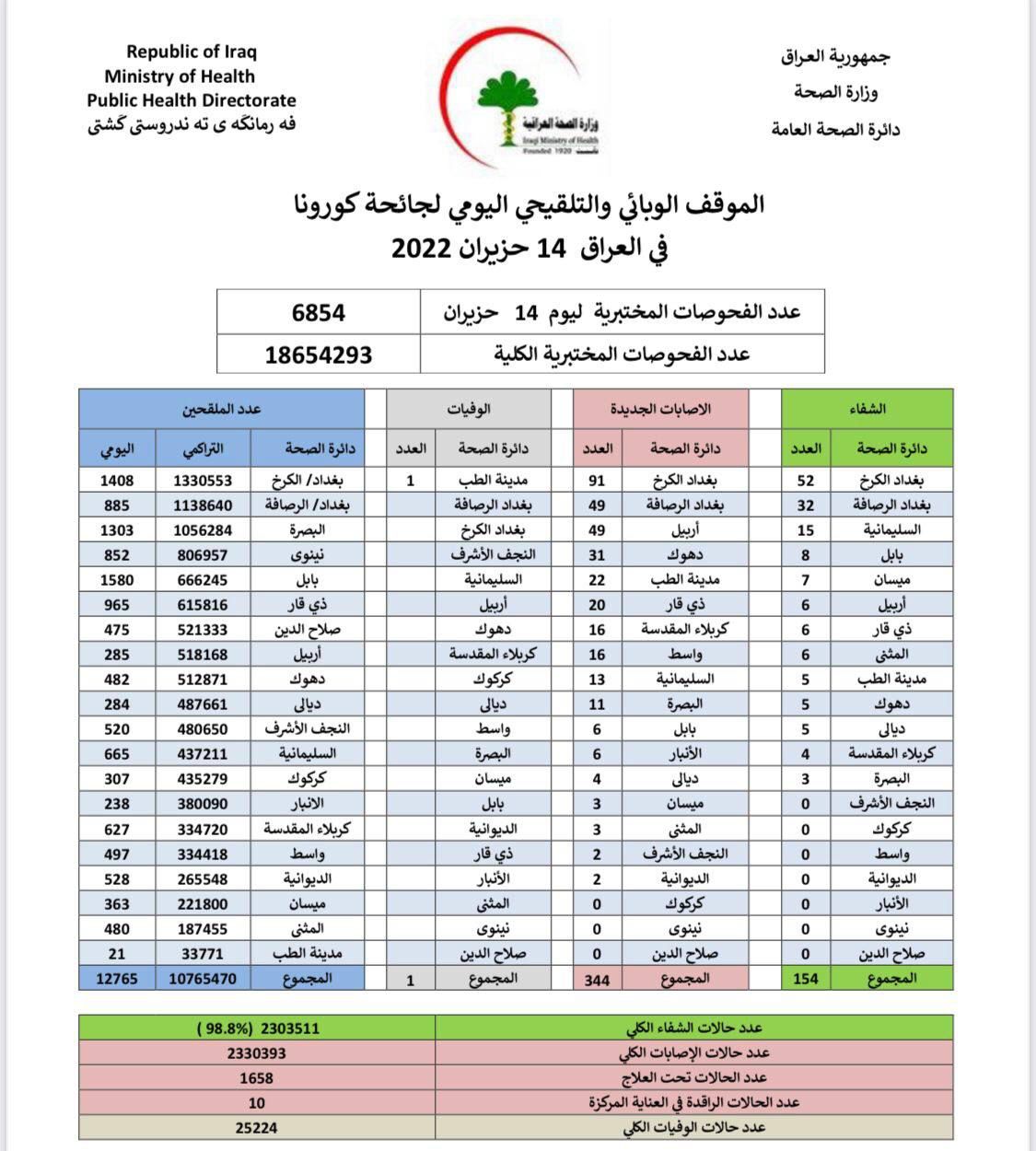 أعلنت وزارة الصحة، اليوم الثلاثاء، الموقف الوبائي اليومي لجائحة كورونا في عموم العراق.