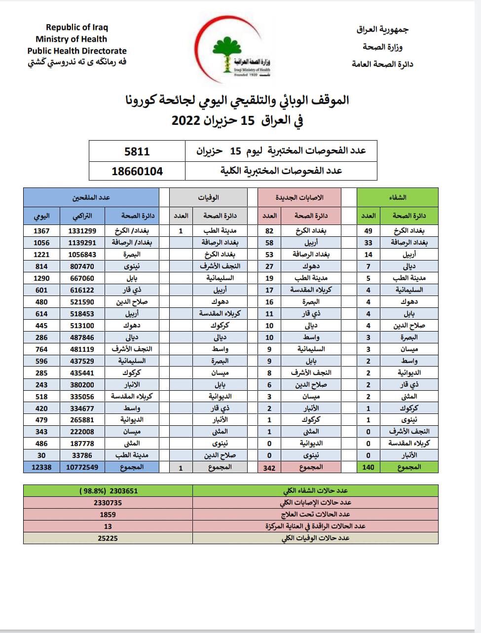 أعلنت وزارة الصحة، اليوم الاربعاء، الموقف الوبائي اليومي لجائحة كورونا في عموم العراق.