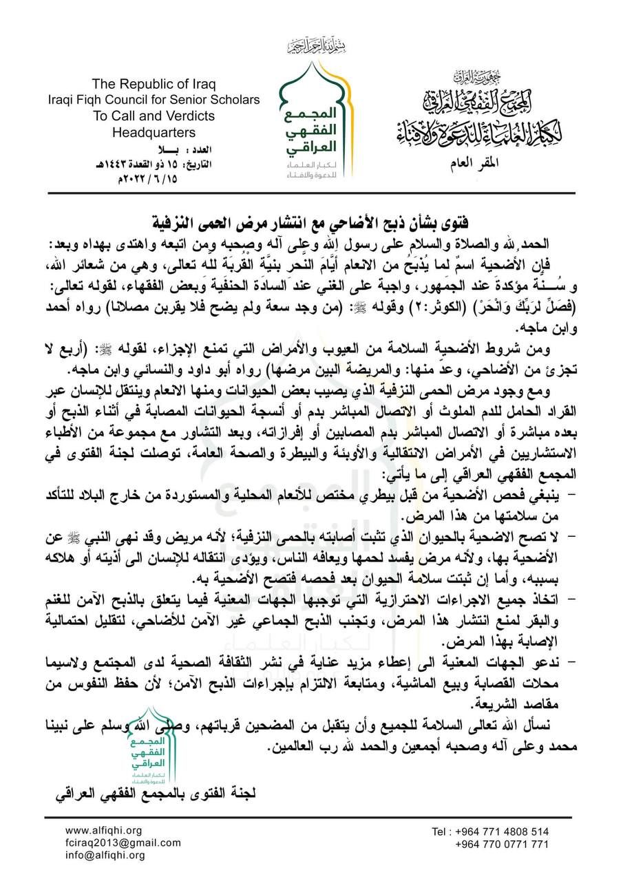 محلياتالمجمع الفقهي: لا تصح الاضحية بالحيوان المصاب بالحمى النزفية قبل 4 سنوات 6 مشاهدات شارك الوسومالحمى النزفيةقد يهمك أيضا سياسة الرئيس الباكستاني يصل إلى بغداد في زيارة رسمية قبل 7 دقائق 3 مشاهدات سياسة الرئيس الحلبوسي يبحث مع طالباني الأوضاع السياسية وأهمية حسم الاستحقاقات الدستورية قبل 31 دقيقة 6 مشاهدات الثامنة نزع السلاح أم الأقنعة؟ قبل 42 دقيقة 6 مشاهدات سياسة كتائب "حزب الله" ترفض نزع السلاح وتؤكد: لا تفاهم مع الحكومة الا بعد خروج القوات الاجنبية قبل 57 دقيقة 13 مشاهدات أمن سرايا السلام تعلن الاطاحة بارهابي في سامراء قبل ساعة واحدة 5 مشاهدات