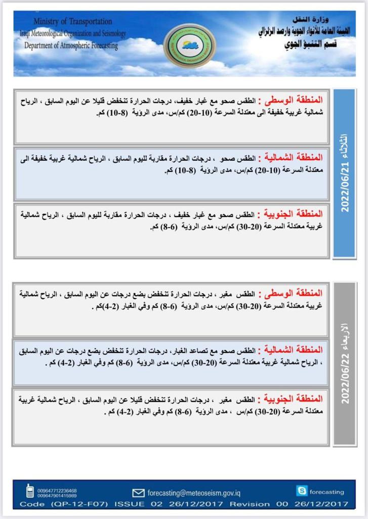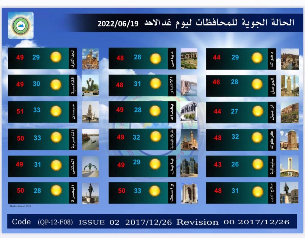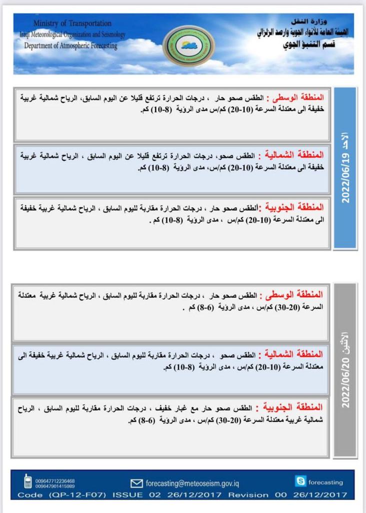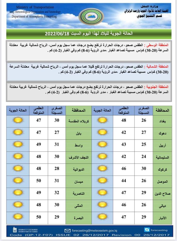 أعلنت هيئة الأنواء الجوية، اليوم السبت، عن حالة الطقس في البلاد للأيام المقبلة، فيما توقعت تصاعداً للغبار وارتفاعاً في درجات الحرارة.