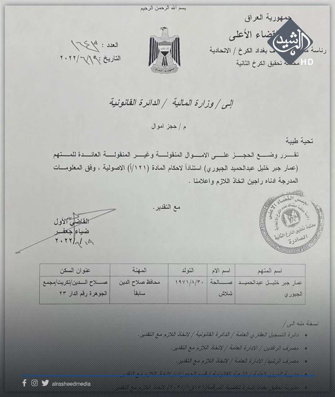 محلياتالقضاء يُقرر حجز الاموال المنقولة وغير المنقولة لمحافظ صلاح الدين المُقال (وثيقة) قبل 4 سنوات 8 مشاهدات شارك الوسومالقضاءعمار جبرقد يهمك أيضا عربي ودولي الولايات المتحدة تدفع 3 آلاف دولار لكل مهاجر غير شرعي مقابل مغادرة اراضيها قبل 5 ساعات 9 مشاهدات الحكم الرابع الاهلي يضرب الشرطة بقوة ويزيد من جراحاتهم آسيوياً.. قبل 5 ساعات 8 مشاهدات رياضة الشرطة يخسر أمام الأهلي السعودي بخماسية في دوري أبطال آسيا قبل 5 ساعات 27 مشاهدات سياسة الإعمار والتنمية يقدم وثيقة للإطار التنسيقي تتضمن 5 معايير لاختيار مرشح رئاسة الحكومة قبل 6 ساعات 13 مشاهدات سياسة الإطار التنسيقي يؤكد موقفه الداعم لحصر السلاح بيد الدولة قبل 6 ساعات 9 مشاهدات