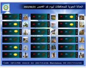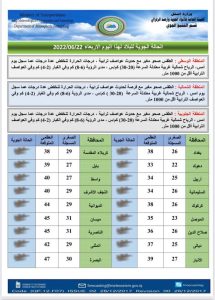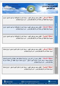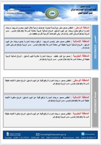 أعلنت هيئة الأنواء الجوية، اليوم الأربعاء، عن حالة الطقس في العراق للأيام المقبلة، فيما توقعت ارتفاعاً بدرجات الحرارة بدءاً من الغد.