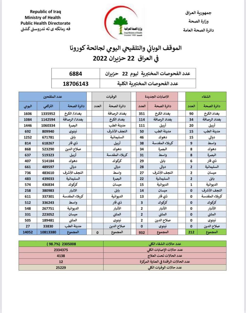 أعلنت وزارة الصحة، اليوم الاربعاء، الموقف الوبائي اليومي لجائحة كورونا في عموم العراق.