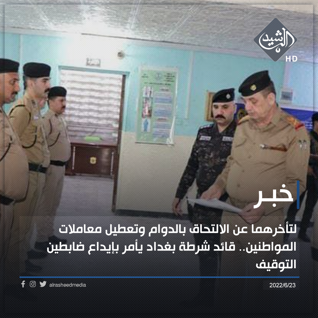 أمر قائد شرطة بغداد اللواء الركن ماجد فالح الموسوي، بتوقيف ضابطين بسبب تأخرهما عن الالتحاق بالدوام الرسمي.