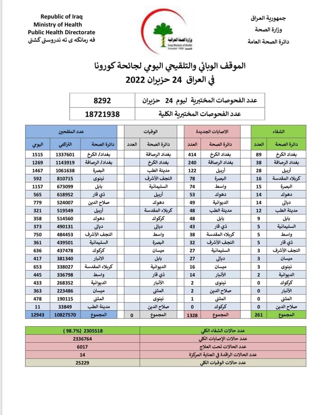 أعلنت وزارة الصحة، اليوم الجمعة، الموقف الوبائي اليومي لجائحة كورونا في عموم العراق.