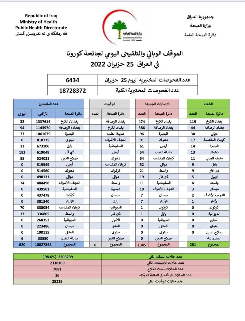 اعلنت وزارة الصحة، الموقف الوبائي لفيروس كورونا في عموم العراق.