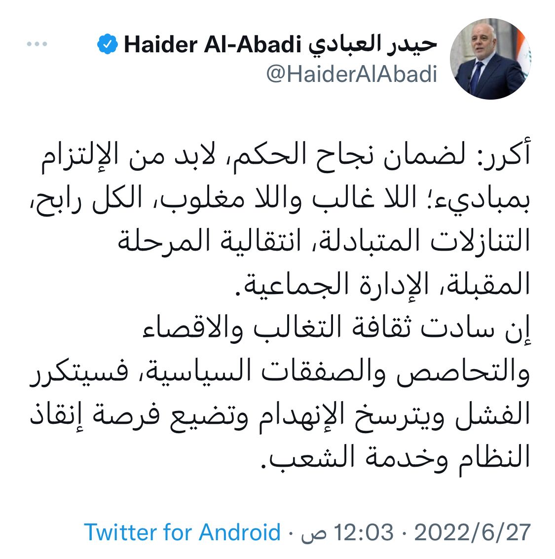 وقال العبادي، في تغريدة على تويتر تابعتها “الرشيد”، “أكرر: لضمان نجاح الحكم، لابد من الإلتزام بمباديء؛ اللا غالب واللا مغلوب، الكل رابح، التنازلات المتبادلة، انتقالية المرحلة المقبلة، الإدارة الجماعية”.
