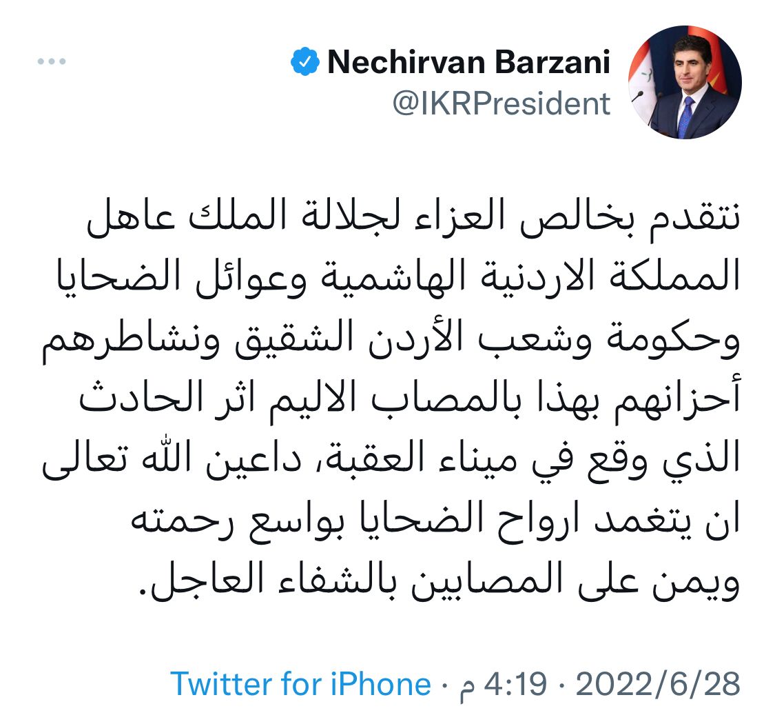 سياسةرئيس اقليم كردستان يعزي ملك الاردن بحادثة ميناء العقبة قبل 3 سنوات 3 مشاهدات شارك الوسوماقليم كردستانالأردنقد يهمك أيضا محليات العراق يستقبل موجة أمطار غزيرة.. الأنواء تحذر من سيول وفيضانات في المناطق غير المخدومة اعتباراً من الغد قبل 12 دقيقة 2 مشاهدات محليات المالية تنفي استقبال نائبة للتفاوض مع وزيرتها بشأن مستحقات المقاولين قبل 39 دقيقة 9 مشاهدات عربي ودولي البيت الأبيض يحذر: أوروبا مهددة بـ"زوال الحضارة" خلال 20 عاماً قبل 43 دقيقة 8 مشاهدات عربي ودولي دول عربية وإسلامية تعلن رفضها لتصريحات إسرائيل بشأن فتح معبر رفح باتجاه واحد قبل ساعة واحدة 7 مشاهدات رياضة المنتخبات العربية في مجموعات صعبة.. الرشيد تنشر القرعة الكاملة للمونديال قبل ساعة واحدة 8 مشاهدات