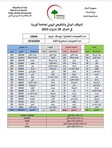 أعلنت وزارة الصحة، اليوم الاربعاء، الموقف الوبائي اليومي لجائحة كورونا في عموم العراق.