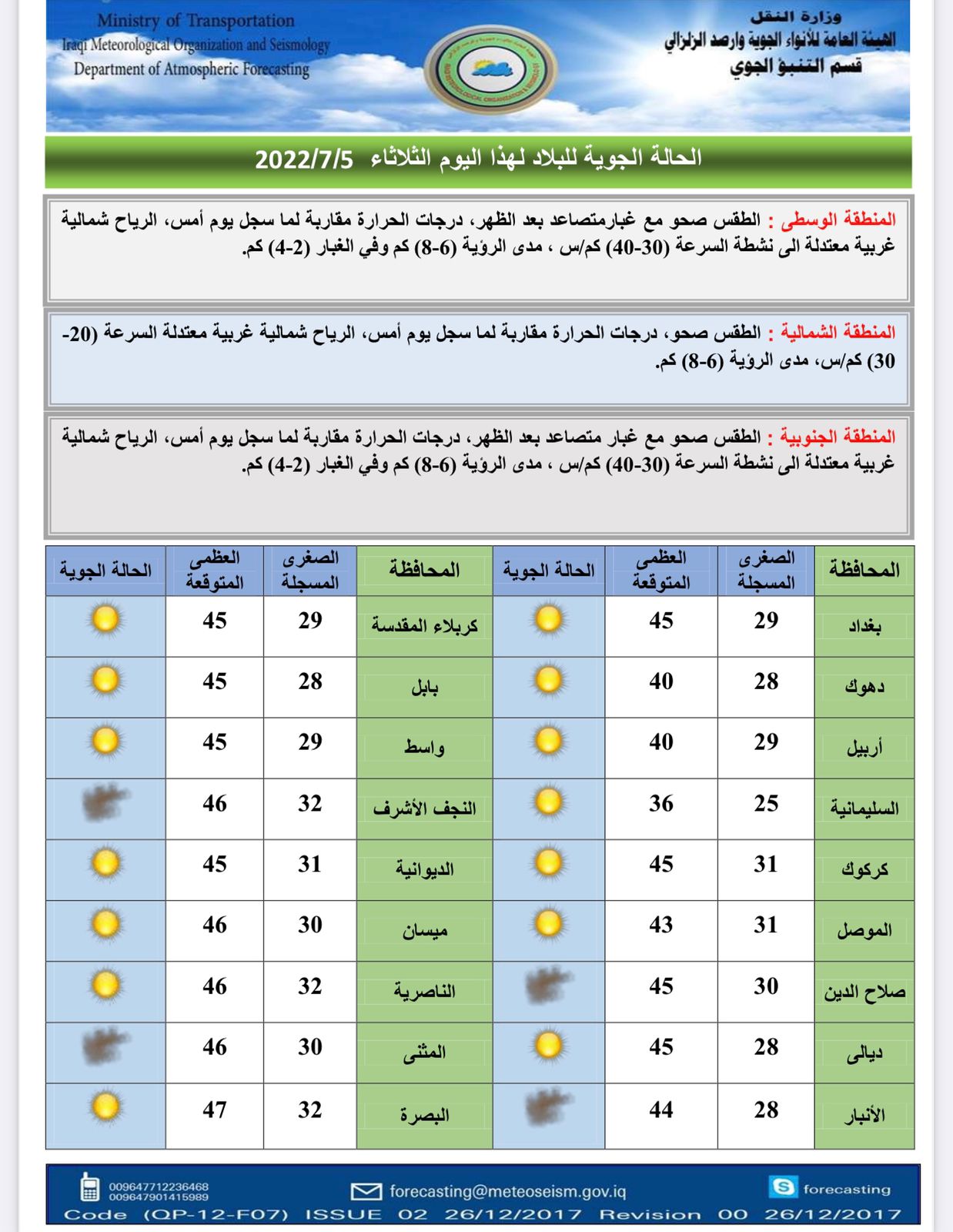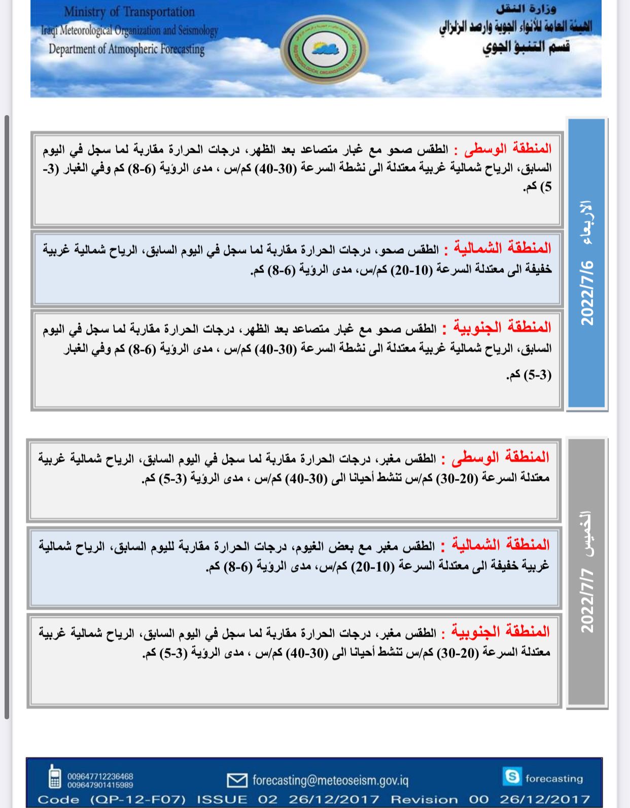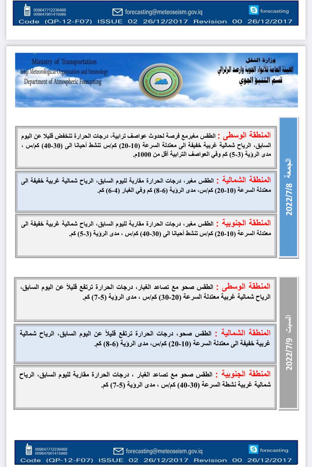 محلياتطقس العراق بأول أيام العيد.. غبار وارتفاع بدرجات الحرارة قبل 3 سنوات 4 مشاهدات شارك الطقسأعلنت هيئة الانواء الجوية، حالة طقس العراق خلال الايام المقبلة، فيما اشارت الى غبار وارتفاع بالحرارة باول ايام عيد الاضحى. الوسومطقس العراققد يهمك أيضا محليات العراق يستقبل موجة أمطار غزيرة.. الأنواء تحذر من سيول وفيضانات في المناطق غير المخدومة اعتباراً من الغد قبل 11 دقيقة 2 مشاهدات محليات المالية تنفي استقبال نائبة للتفاوض مع وزيرتها بشأن مستحقات المقاولين قبل 38 دقيقة 9 مشاهدات عربي ودولي البيت الأبيض يحذر: أوروبا مهددة بـ"زوال الحضارة" خلال 20 عاماً قبل 42 دقيقة 8 مشاهدات عربي ودولي دول عربية وإسلامية تعلن رفضها لتصريحات إسرائيل بشأن فتح معبر رفح باتجاه واحد قبل ساعة واحدة 7 مشاهدات رياضة المنتخبات العربية في مجموعات صعبة.. الرشيد تنشر القرعة الكاملة للمونديال قبل ساعة واحدة 8 مشاهدات