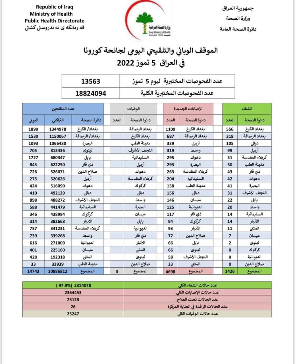 أعلنت وزارة الصحة، اليوم الثلاثاء، الموقف الوبائي اليومي لجائحة كورونا في عموم العراق.
