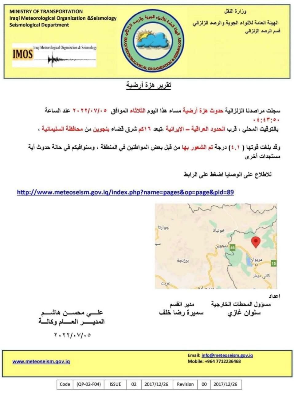 اعلنت الهيئة العامة للانواء الجوية والرصد الزلزالي التابعة لوزارة النقل، اليوم الثلاثاء، تسجيل هزة أرضية بقوة 4.1 درجة في السليمانية.